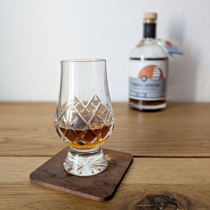 Wenden wir uns dem Tequila Nueve Añejo zu. Die 2 Jahre im Ex-Bourbon-Fass haben ihre Spuren hinterlassen, ein leicht blasses Sonnenblumengelb zeugt davon. Man sieht beim Drehen des Glases eine leichte Viskosität, lebendig bewegt sich der Brand im Glas und hinterlässt dabei dünne Beinchen an der Glaswand.