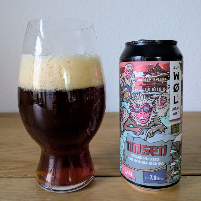 Bei diesem Bier hat ganz klar die Gestaltung des Etiketts den Kaufimpuls gegeben – die japanischen Affen, die im heißen Wasser sitzen, sind mir so sympathisch, ich liebe heißes Badewasser mehr als alles andere. In Japan nennt man solche heißen Quellen Onsen, und sie sind ein traditioneller Ort der Entspannung dort, sowohl für Menschen als auch für Affen. Die Quellen gaben dem Zum Wøl Brauart Onsen Spiced Infused Red Double Rice IPA ihren Namen, das ist nicht nur rein willkürlich gewählt, man will damit vielleicht auf die Reisflocken als Zutat anspielen und so einen asiatischen Klang erzeugen. Neben dem Reis findet man in dem auf 7% Alkoholgehalt eingestellten Bier noch Haferflocken, die Hopfensorten Cashmir, Saphir, Pacific Jade und Talus – und, wie schon im Namen ebenso deklariert ist, Gewürze, genauer gesagt Zimt, Piment, Muskat, Ingwer und Kardamom. Also gibt es viel zu entdecken, oder? Ich hatte vor einer Weile das Zum Wøl Brauart Du Geila aus derselben Brauerei sehr positiv besprochen, kann das Onsen da mithalten?