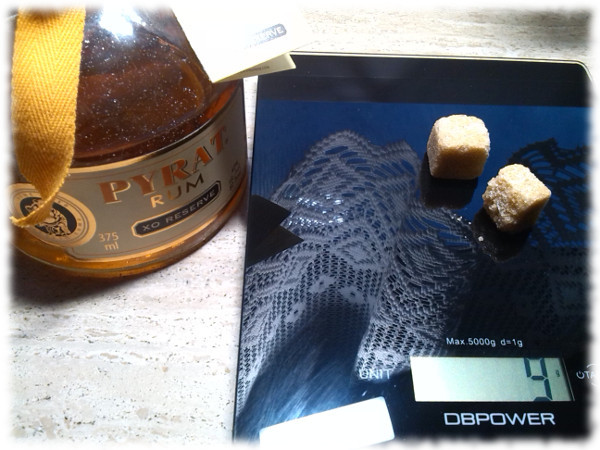Gleichzeitig hat der Pyrat überraschend wenig Körper, da war ich schon mehr als ein bisschen enttäuscht. Im Vergleich zu anderen Rums ist er fast dünn und hat kein Volumen. Das merkt man dann auch am Gaumen – deutlichst spür- und schmeckbare Alkoholnoten, als wäre er grade frisch aus der Destille gelaufen und nur wenig gereift (bis zu 15 Jahre steht im Beipackzettel – wahrscheinlich liegt die Betonung ganz stark auf dem „bis zu“, der Löwenanteil wird eher maximal 2 Jahre alt sein). Für diesen Rum werden ca. 24g/l Zucker undeklariert beigemischt, also 9g pro kleinem Fläschchen.