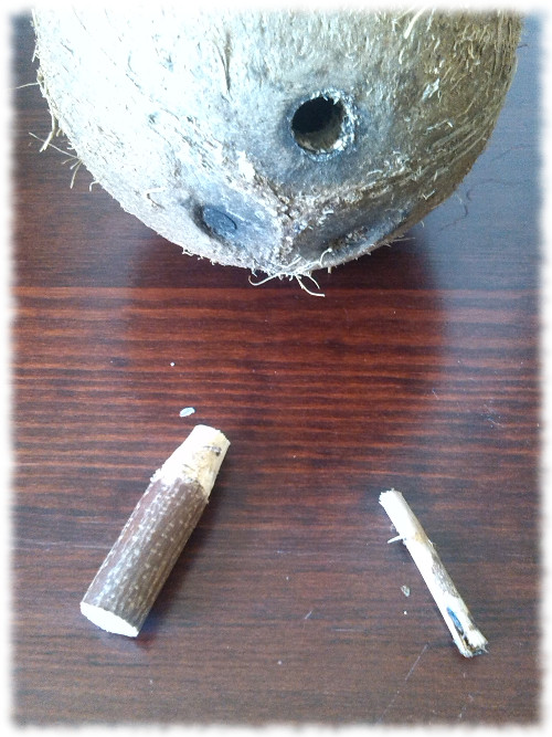 Aus Aststücken aus dem Garten habe ich mir rustikale Stöpsel gebastelt, mit denen die Nuss nachher wieder verschlossen werden sollen. Mit ein bisschen Schnitzarbeit passen die Stöpsel perfekt in die Löcher.