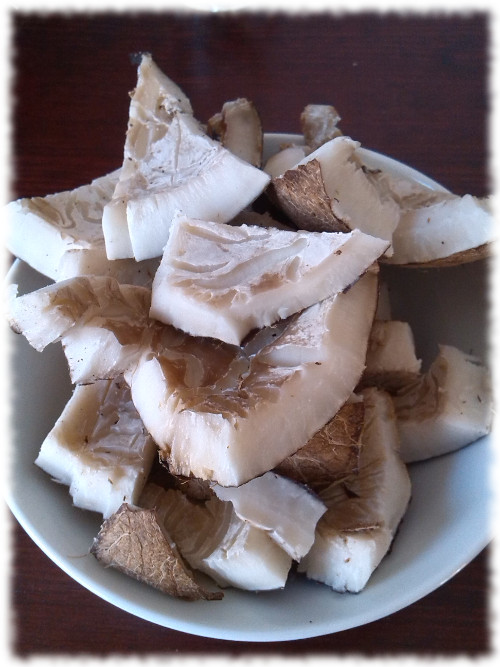 Die Kokosnuss ist mit ein paar festen, assertiven Schlägen mit einem haushaltsüblichen Hammer schnell geknackt. Man sieht sehr schön, wie sich der Alkohol an manchen Stellen des Fruchtfleischs zu schaffen gemacht hat. Mit einem kurzen Messer kann man das Fruchtfleisch leicht aus der Schale lösen.