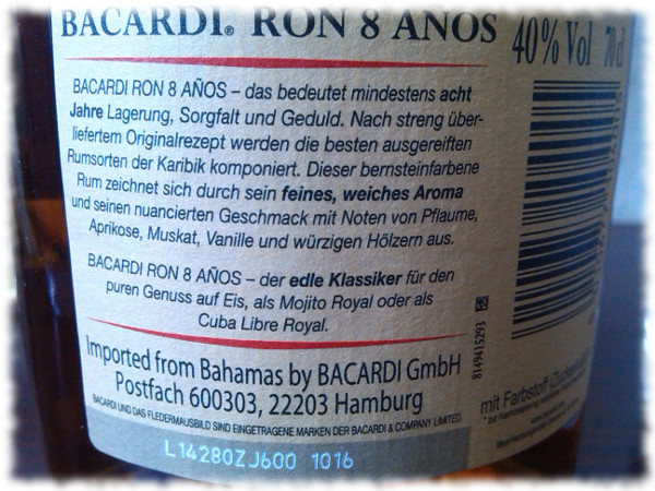 Der noch beste Fall ist, wenn die Konsumhinweise wenigstens die Möglichkeit einräumen, dass man Rum auch pur trinken kann. Manchem Rumverschnittgeschädigten muss man das wahrscheinlich tatsächlich sagen. Doch schon schnell folgt die erste Einschränkung, wie auf dem Etikett zu Bacardis sehr gutem Ron 8 Años zu lesen ist: „für den puren Genuss auf Eis“. Man soll also die Geschmacksstoffe mit Eis abtöten, um nicht zu viele davon abzukriegen. Kein Zeichen von großem Vertrauen ins eigene Produkt. Direkt anschließend noch der Hinweis, dass auch Cocktails und Longdrinks mit diesem Rum herstellbar sind. Nett! Fehlt noch der Hinweis, dass man es zum Gurgeln oder für die Scheibenwischanlage im Auto benutzen kann.