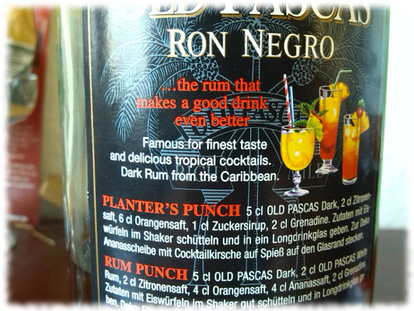 Oft sind ähnliche Aussagen nicht dermaßen klar formuliert, sondern in Sätzen und Hinweisen verklausuliert. „…the rum that makes a good drink even better“ schreibt beispielsweise der Hersteller von Old Pascas Ron Negro auf das Label. Prominent sind Cocktailbilder platziert, und Rezepte für ein paar der üblichen Verdächtigen des Rumcocktails. Auch hier traut man sich wohl kaum, dem Trinker einen Purgenuss nahezulegen.