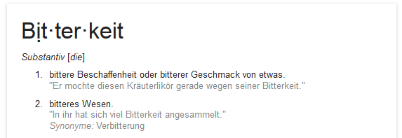 Deutsche Sprache – schwere Sprache. Ich habe in meinen ganzen Rezensionen bisher immer, wenn es um Cocktail Bitters oder Bier ging, von „Bitterkeit“ gesprochen. Ein IPA ist bitter, daher hat es eine hohe Bitterkeit. Doch eine Seite, die sich explizit mit diesem Geschmackseindruck beschäftigt, redet immer von „Bittere“. Ich bin verwirrt. Was hat es damit auf sich? Ist das so wie mit dem zwiegespaltenen Plural des Worts „Wort“? Es gibt „Worte“ und „Wörter“ – gibt es also auch eine „Bitterkeit“ und „Bittere“ mit Spezialgebräuchen? Das moderne Standardwerk für die Verwendung der deutschen Sprache, Google, hat folgendes in petto: