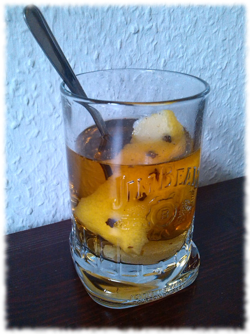 Ein großes Stück unbehandelte Zitronenschale mit 4 Nelken spicken und dazugeben sowie