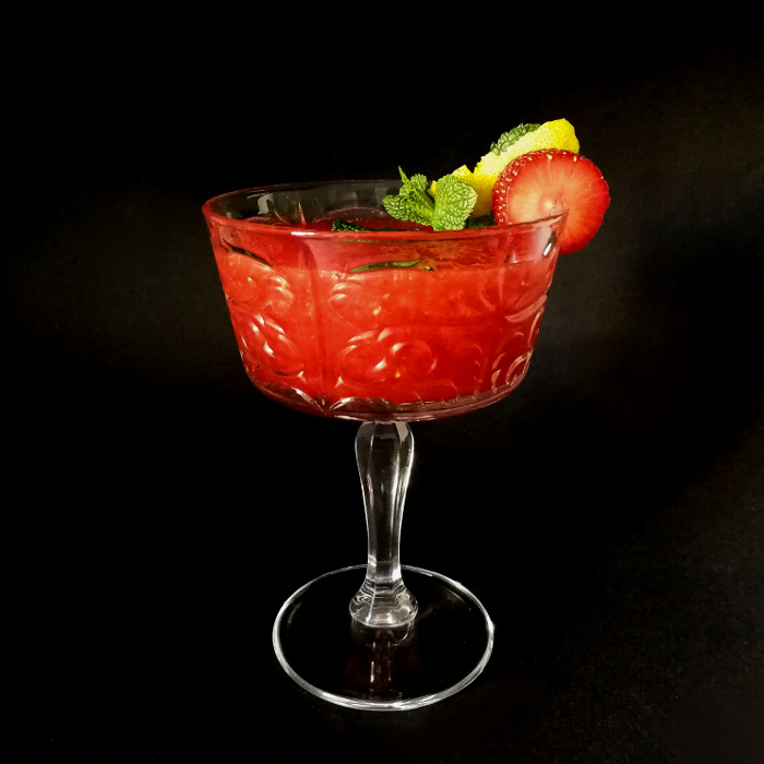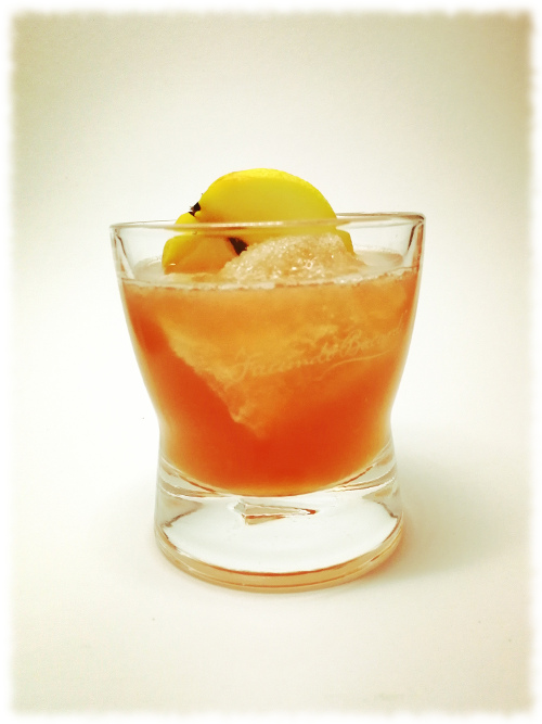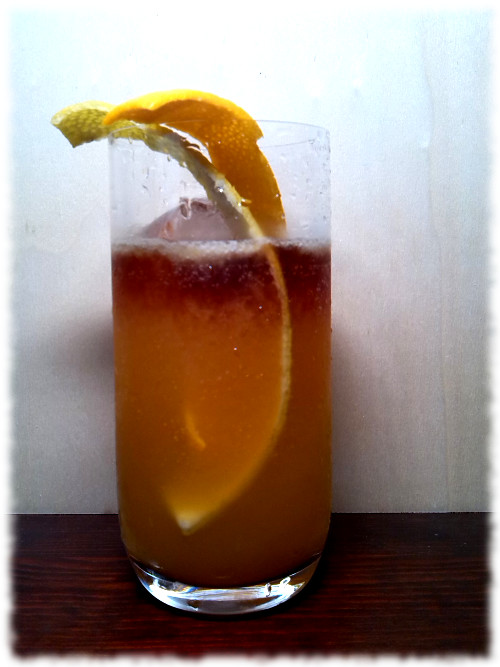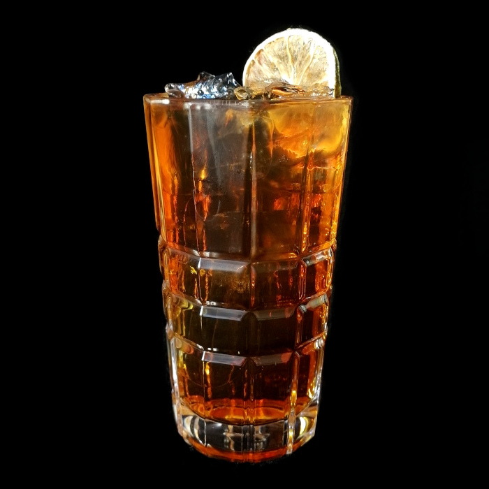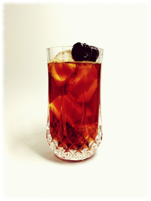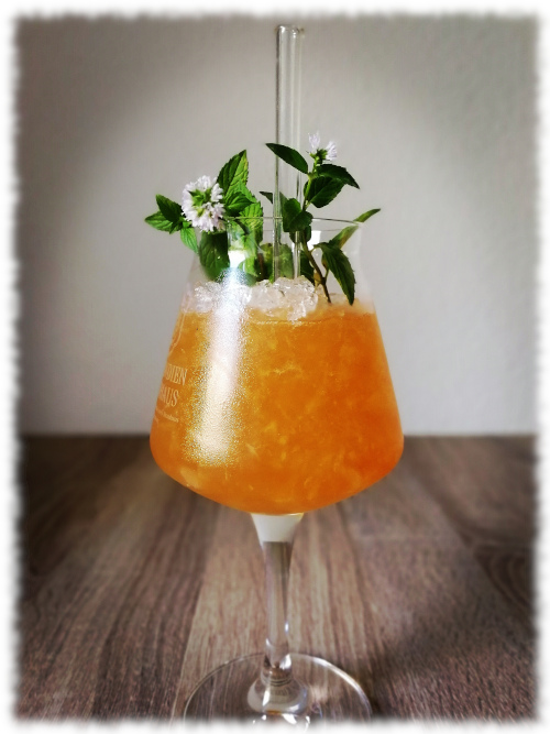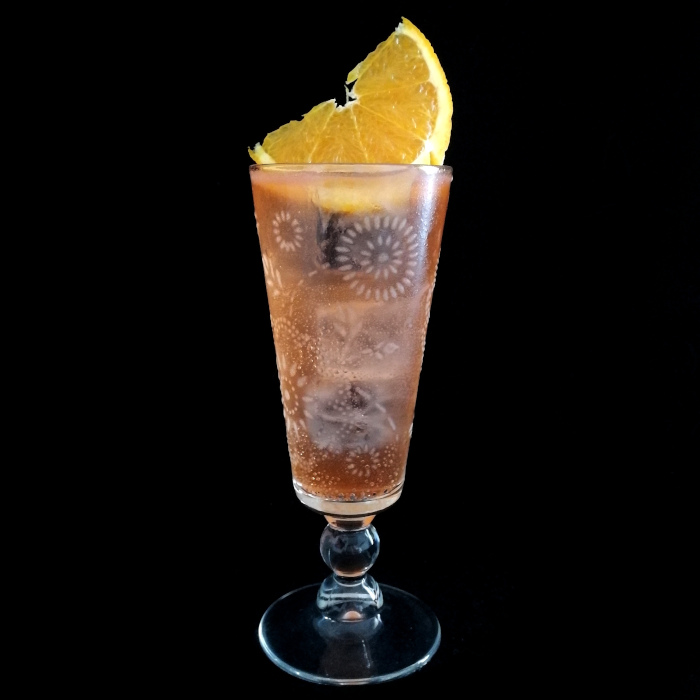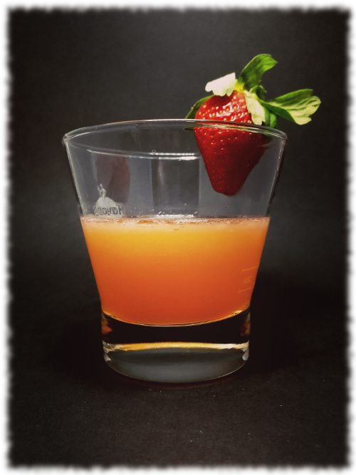 Mit einer Cocktailkirsche und einer Orangenscheibe dekoriert servieren.