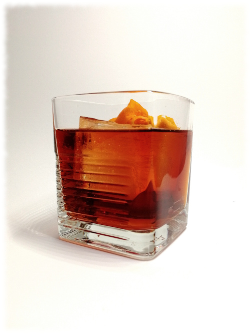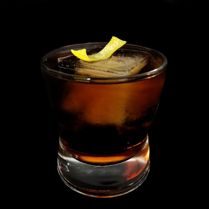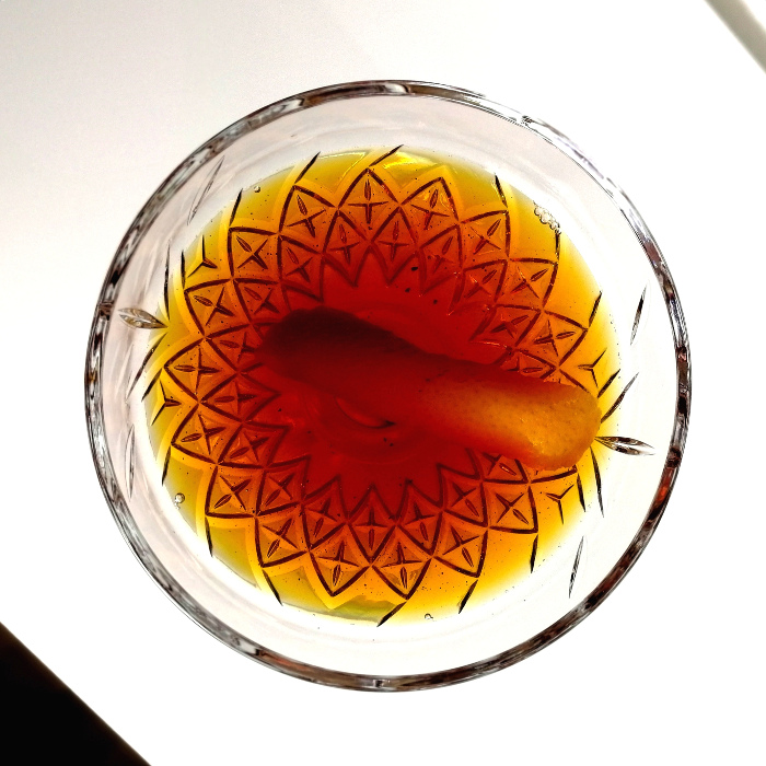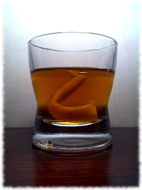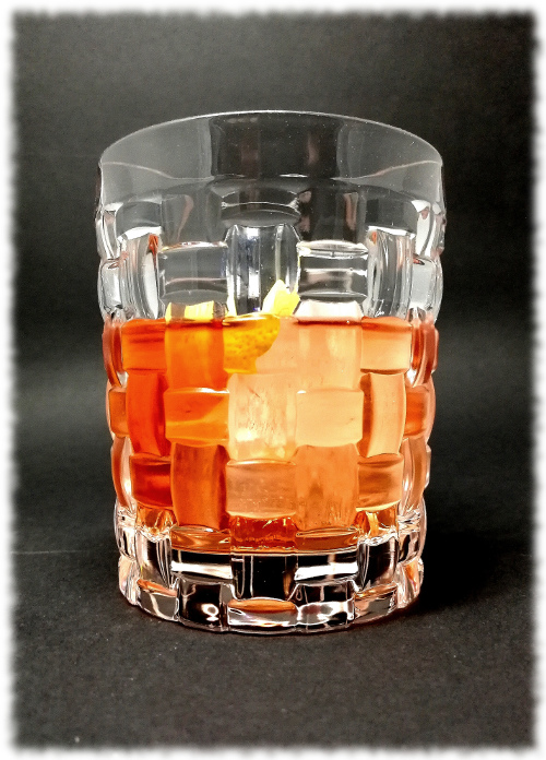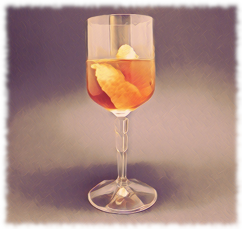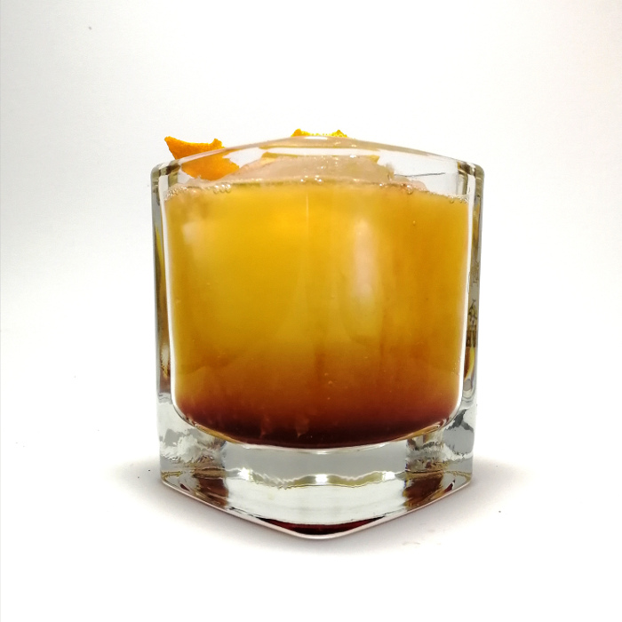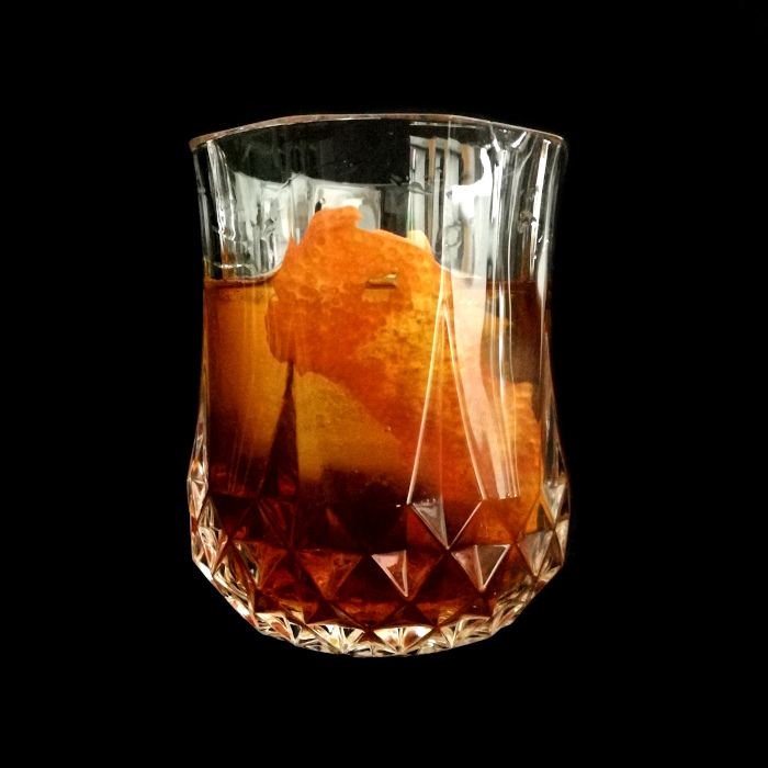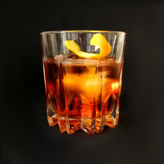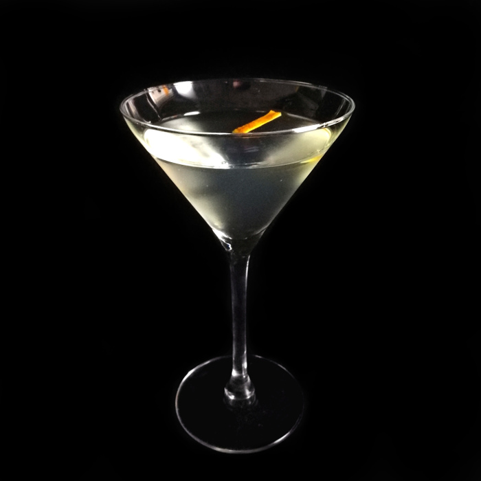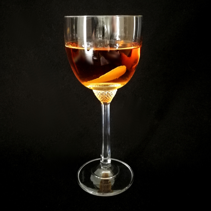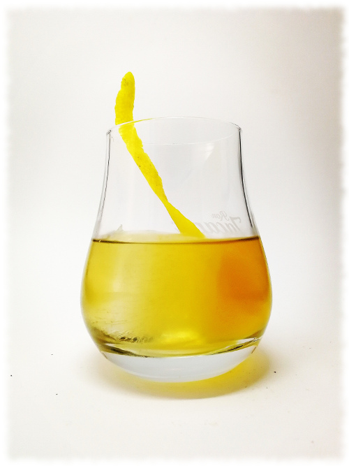 Auf Eis rühren. Mit einer Orangenzeste absprühen und dekorieren.