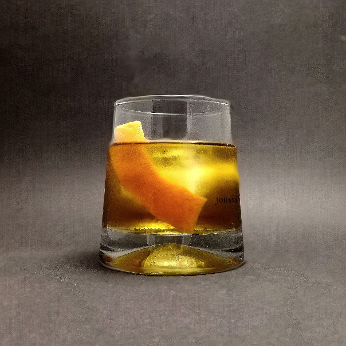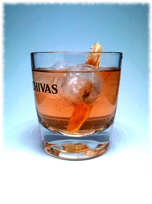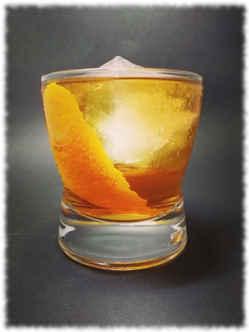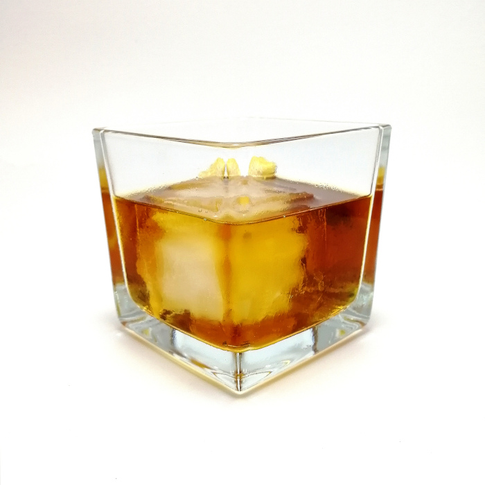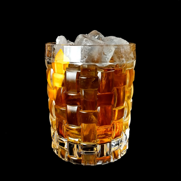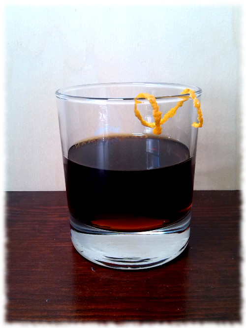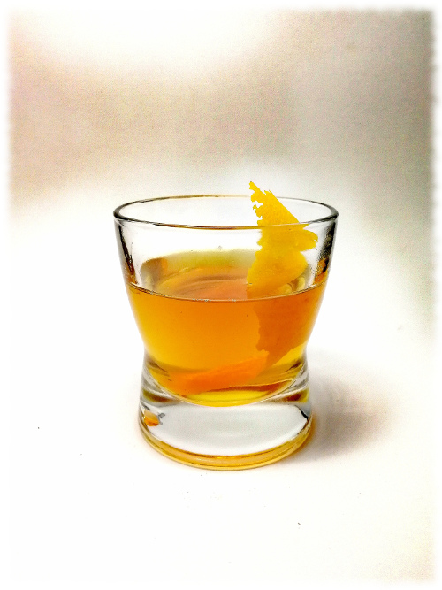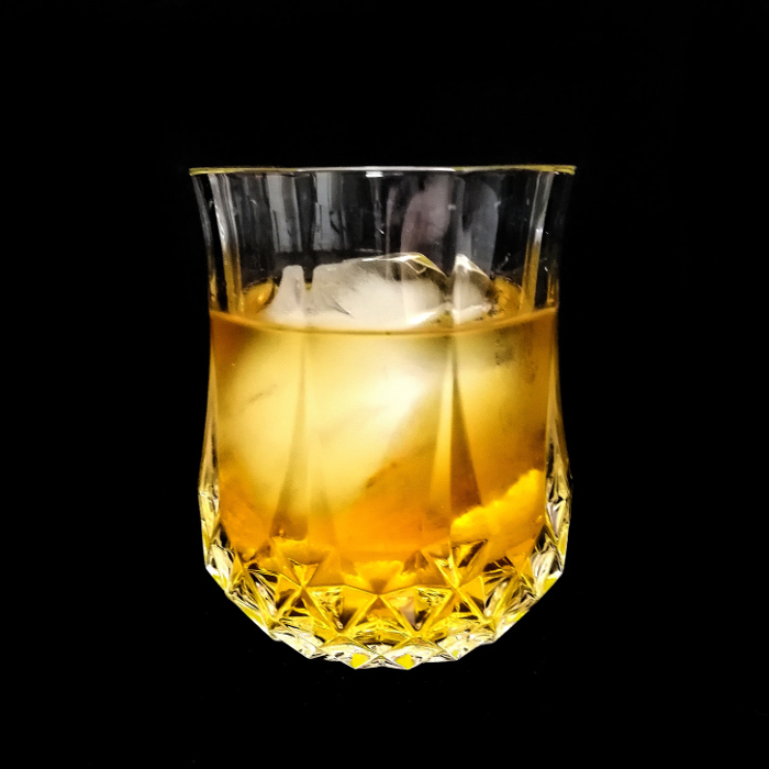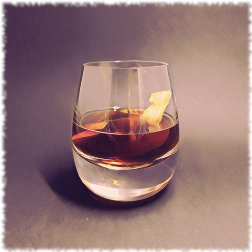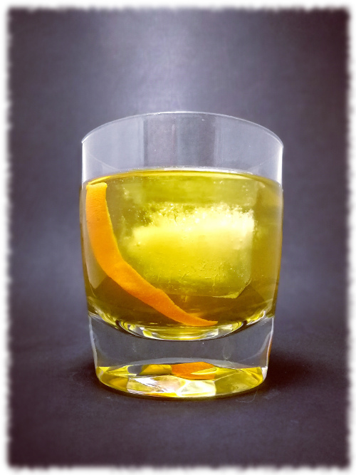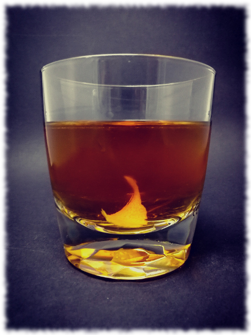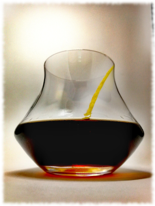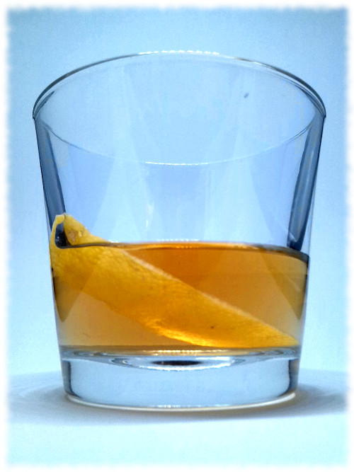Auf Eis rühren. Mit einer Orangenzeste absprühen und dekorieren.