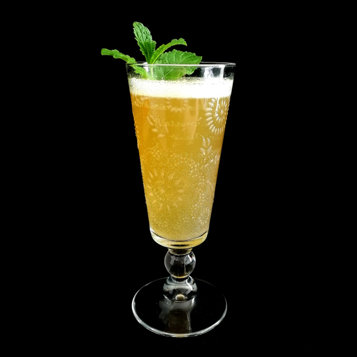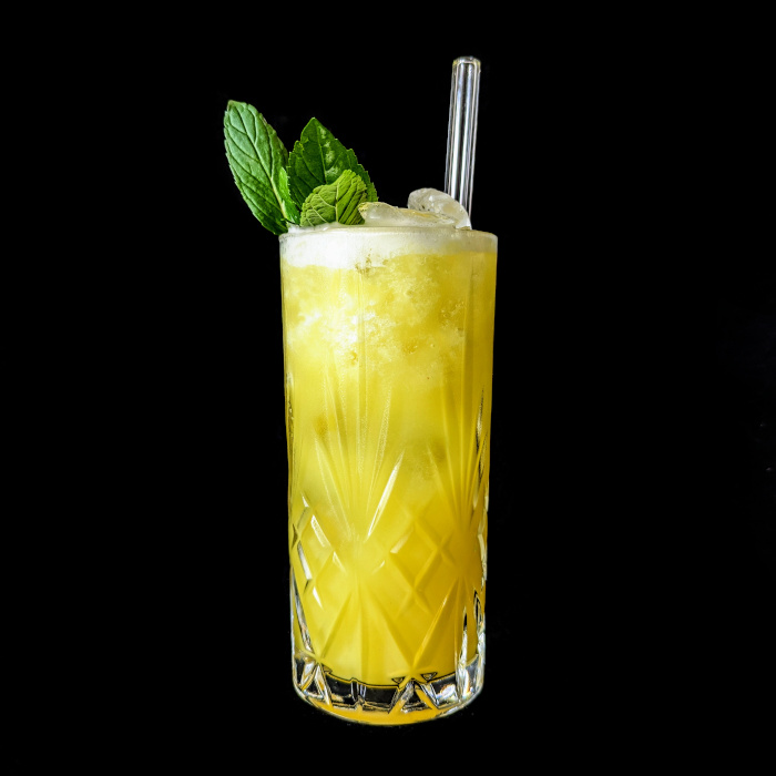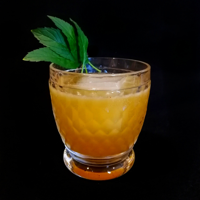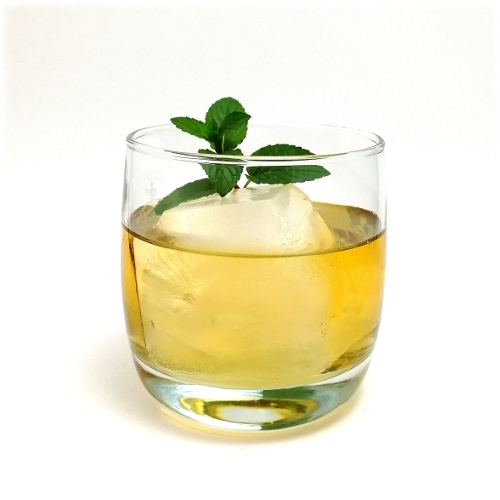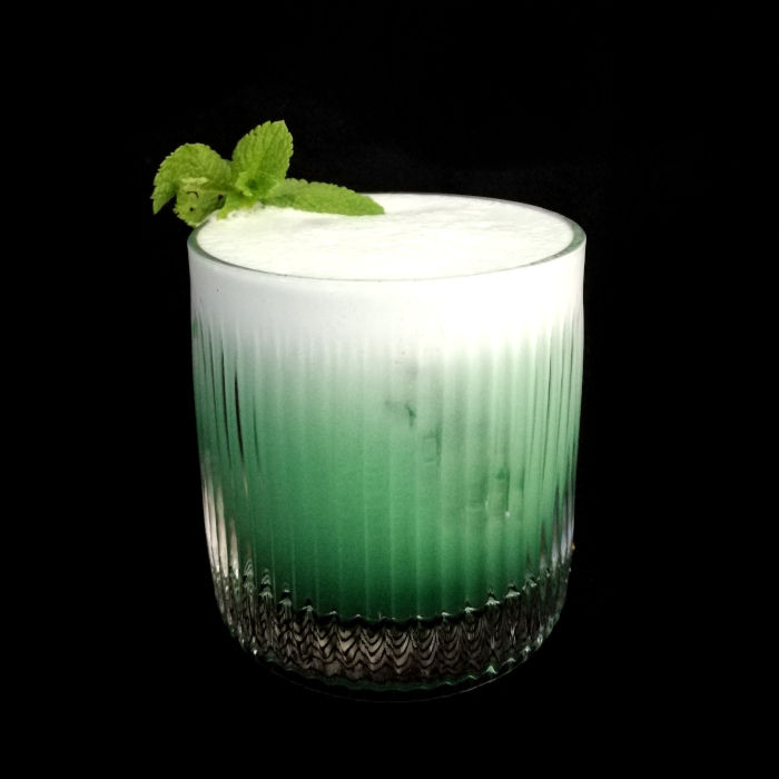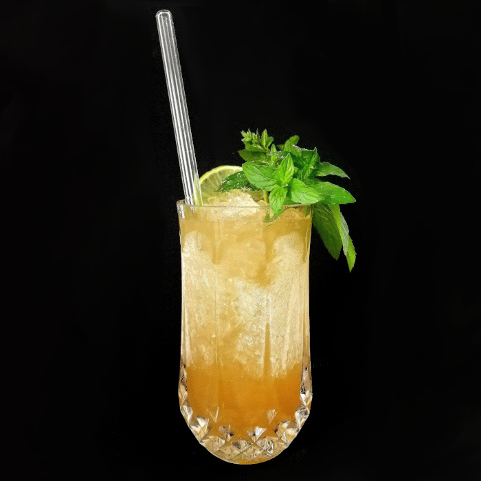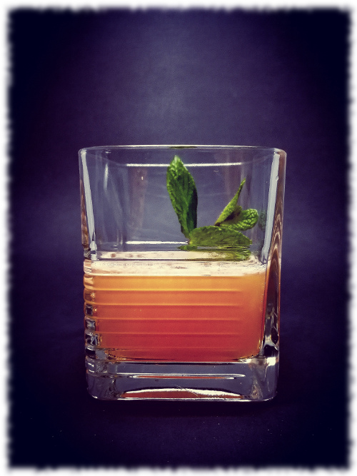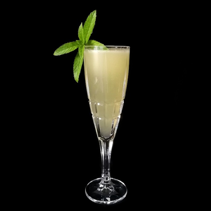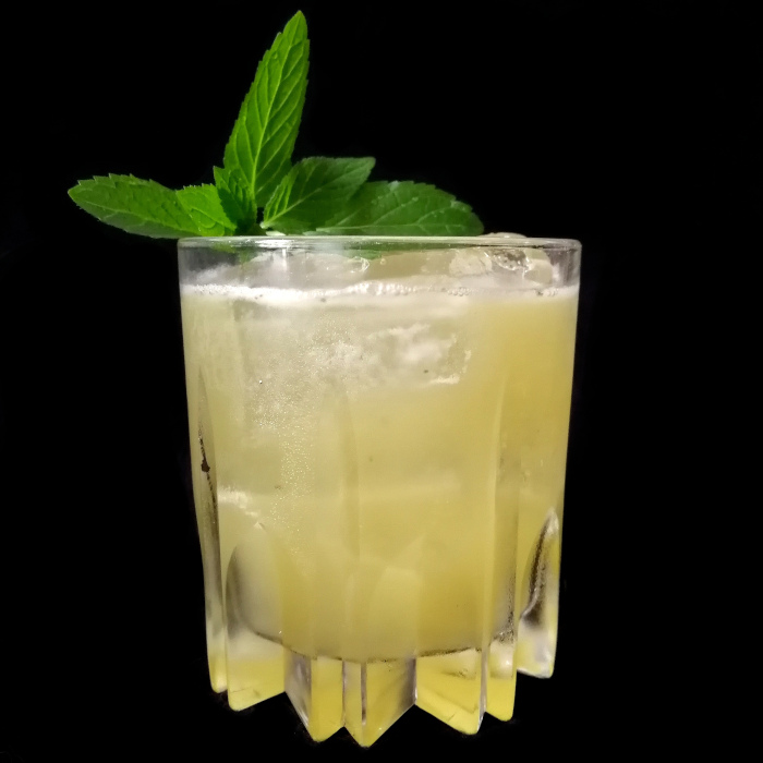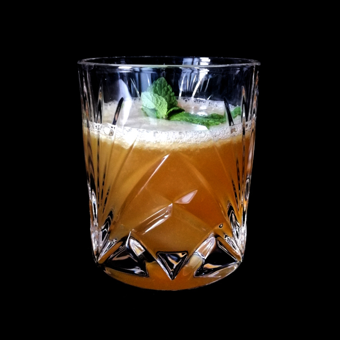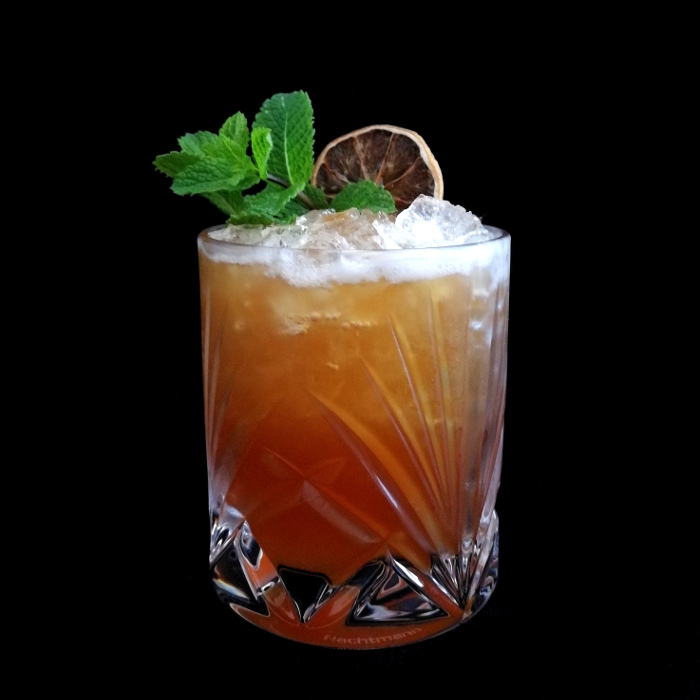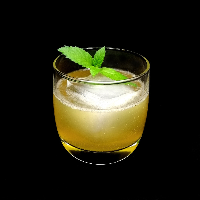Auf Eis shaken. Auf frisches Eis abseihen und mit Minze dekorieren.