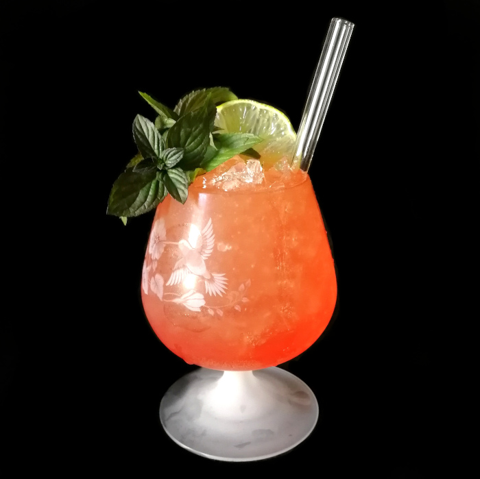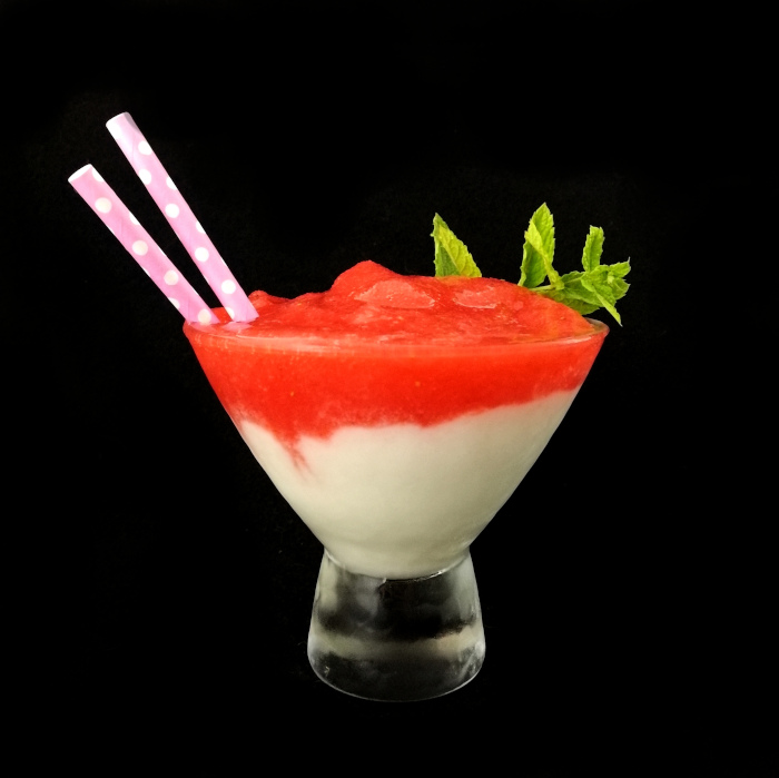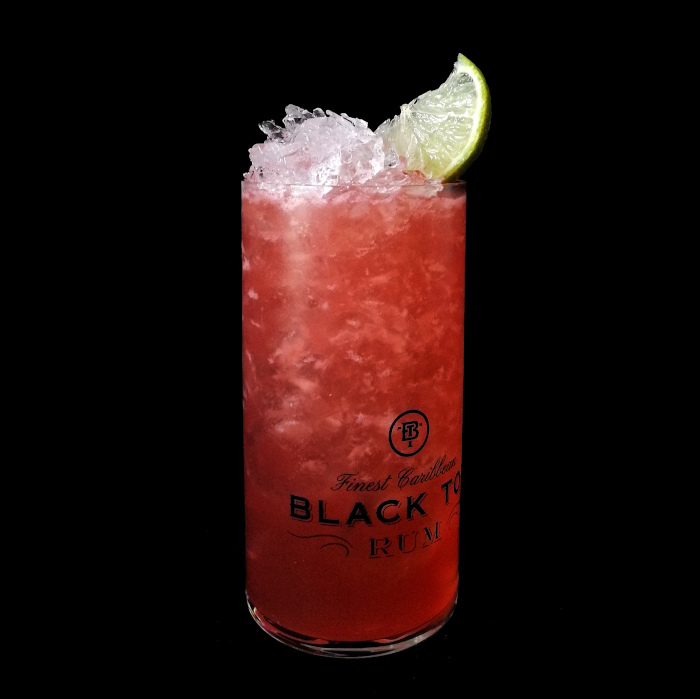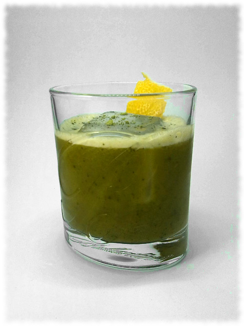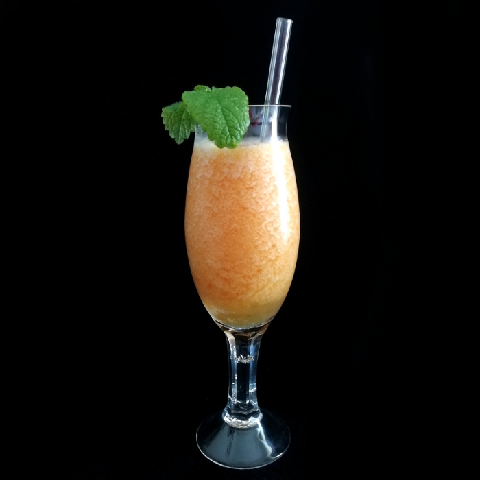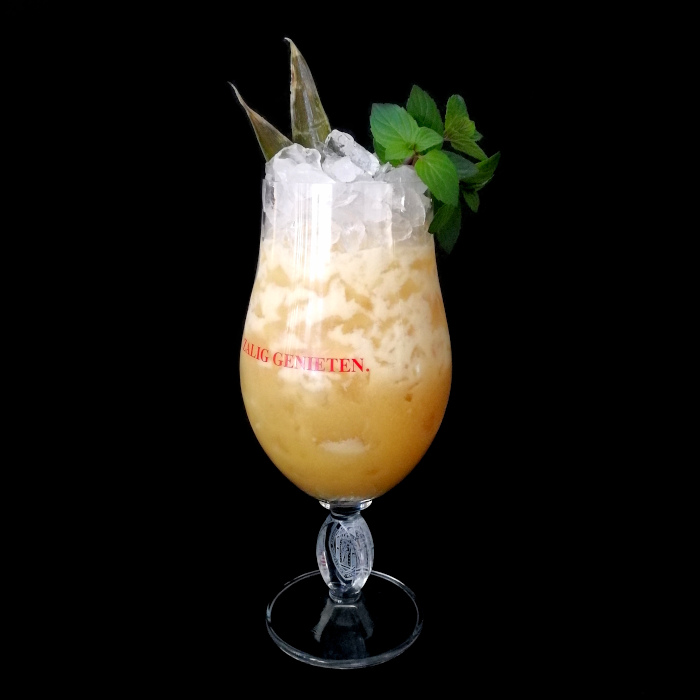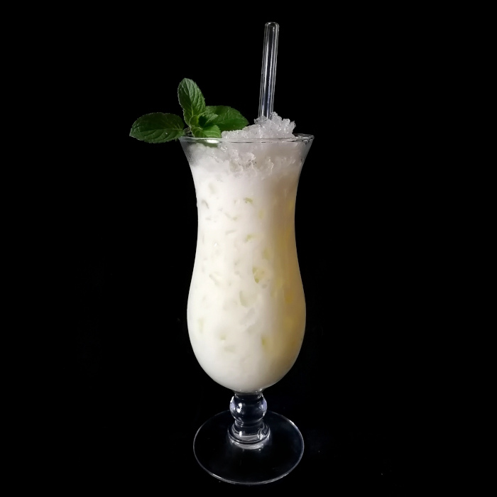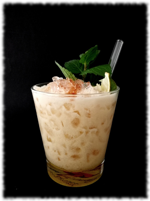 Mit crushed ice im Mixer blenden.