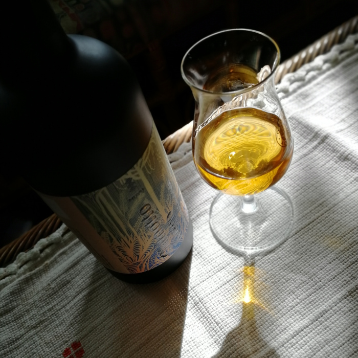 Die Farbe jedenfalls gibt die grobe Stoßrichtung schon vor. Ein leuchtendes, kräftiges Orange, lange schon blühende Sonnenblumen, sehr hübsch. Woher sie kommt, kann ich nicht sagen, denn eine Fassreifung findet nicht statt – es ist also wohl Farbstoff, wenn nicht irgendwelche der Zutaten nach der Destillation der Einzelbestandteile noch zugefügt wurden. Jedenfalls passend! Beim Schwenken bewegt sich der Muyu gemächlich mit schönem Glaswandverhalten.