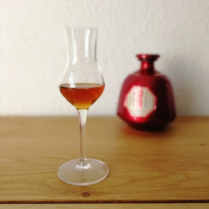 Schon beim Eingießen wird hier nun auch optisch deutlich, dass Huangjiu und Baijiu zwei Paar Stiefel sind. Die rote Tochter (das ist die Übersetzung des Markennamens 女兒紅) erinnert mehr an einen Bourbon als an den chinesischen Hirseschnaps – rotbraun, Pariser Rot, mit dunkelorangenen Lichtreflexen. Im Glas bewegt sich die Flüssigkeit schwer, deutlich schwerer jedenfalls, als ich ihr mit den 14% Alkoholgehalt zugetraut hätte. Das Glaswandverhalten ist jedoch jenem entsprechend, man sieht kaum Rückstände.