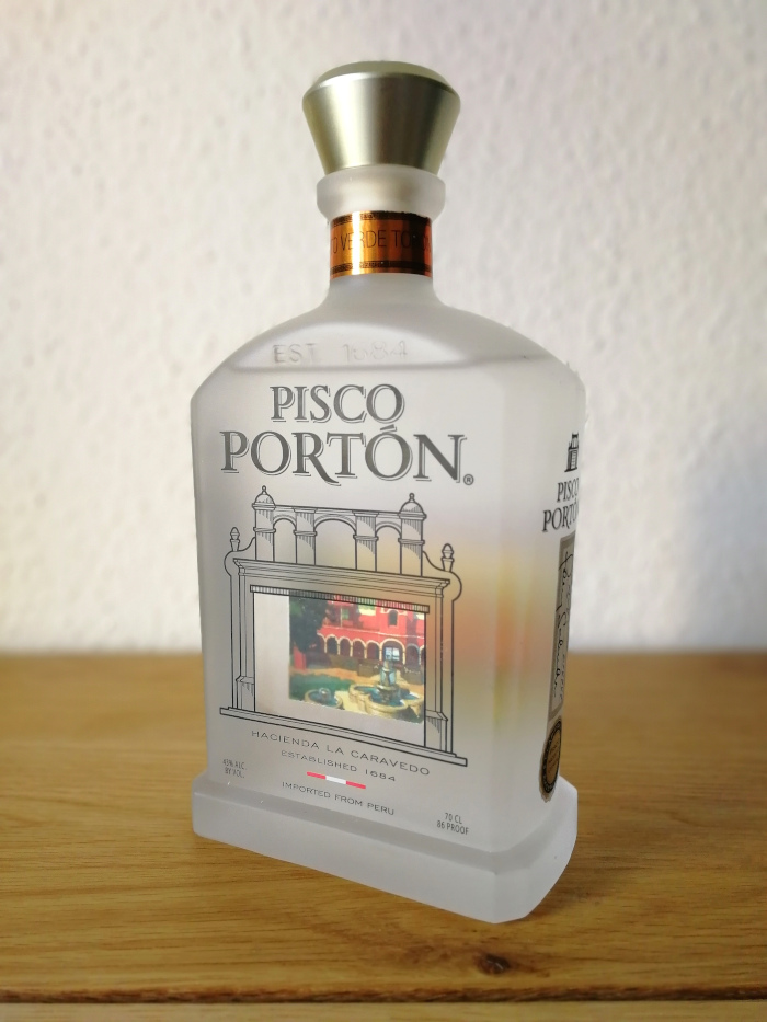 Er weiß, wovon er redet, in seiner Zweitkarriere als Meisterbrenner (in Südamerika kennt ihn jedes Kind, da er vorher ein großer TV-Star mit eigener Fernsehsendung war) verantwortet er die Herstellung einer der größten Piscomarken in der laut eigener Aussage ältesten Destillerie in ganz Amerika. Stellvertretend für seine unterschiedlichen Piscos stelle ich heute den Pisco Portón Mosto Verde Torontél vor. Mosto Verde ist eine der möglichen Typen bei Pisco, der Fermentationsprozess wird dabei vorzeitig unterbrochen, und so bleibt einiges an Fruchtzucker im Most, den die Hefen nicht aufessen und umwandeln – was sich idealerweise in der Charakteristik der Spirituose später nach dem Destillieren als besondere Fruchtigkeit erhalten bleibt. Torontél ist eine der erlaubten aromatischen Rebsorten, was dies zusätzlich unterstützen wird, rein von der Theorie her. Probieren wir es aus!