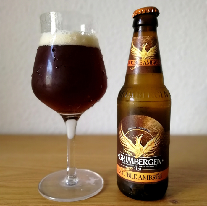 Fangen wir mit dem helleren der beiden Biere an. Das Grimbergen Blonde ist kristallklar im Glas, mit einem der Flaschenfarbe sehr ähnlichen Ton, einer Mischung aus Haselnussbraun und gehämmertem Messing. Schaum ist eher Mangelware, schon beim Eingießen entsteht kaum welcher, und nach einer Weile ist höchstens noch eine Idee davon da. Ordentlich gekühlt gibt es kaum einen Geruch von sich, leichte Getreidetöne vielleicht, ein Anflug von dunkler Frucht, etwas leicht rostige Stahlnägel. Kein Bier, an dem ich lange schnuppern muss.