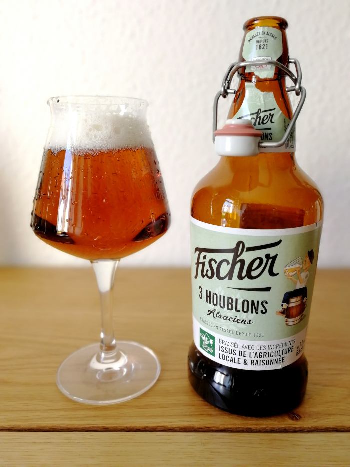 Die Erwartung an das Fischer 3 Houblons Alsaciens ist nach der Erfahrung des Blonde Tradition nicht besonders hoch, insbesondere, da die drei namensgebenden alsässischen Hopfensorten nicht namentlich erwähnt werden, und dann auch nur als Hopfenextrakt und nicht als Frischhopfen eingesetzt werden. Mit 7,2% Alkoholgehalt ist es etwas stärker, und obergärig eingebraut. Hier hat man sich auch entschieden, zusätzlich zum Glukosesirup auch noch Zucker einzusetzen – die Erwartungshaltung sinkt immer mehr.