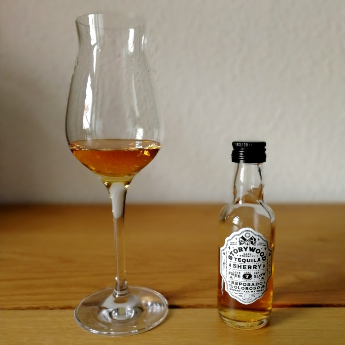 Die Standardabfüllungen haben wir damit hinter uns, kommen wir zu den auch im Set enthaltenen „Limited Editions“, in denen zum Teil die Idee des Scotchfassreifens aufgegeben wird. Im Storywood Tequila Sherry 7 Reposado 53% hat man stattdessen ein Oloroso-Sherryfass verwendet und nach 7 Monaten in Fassstärke abgefüllt. So ein frisches Sherryfass hat natürlich eine ganz andere Färbungskraft, das sieht man hier – der Tequila wird bernsteinfarben, mit orangenen und goldenen Lichtreflexen. Auch geruchlich findet man hier viel fruchtigere Noten, die die aber immer noch dominierende Agave und nun sehr erkennbare Mineralität mit Rosinen, getrockneten Pflaumen und gedörrtem Apfel unterfüttern. Wie schon bei einem der Vorgänger fällt mir auf, dass die durchaus schönen Aromen schnell verfliegen, leider.