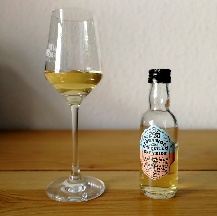 In klassischer Vielverkostermanier beginnen wir mit dem leichtesten, jüngsten, und steigern uns dann. Also steht erstmal der Storywood Tequila Speyside 7 Reposado 40% vor mir im Glas. Die Zahl „7“ auf dem Etikett bedeutet hier Monate, nicht Jahre, wie man das vielleicht von Whisky gewohnt ist – bei Tequila ist das durch die Alterskategorie „Reposado“ eigentlich klar, denn dieser ist immer unterjährig gereift. Farblich äußern sich diese 7 Monate in einer strohigen, blassgoldenen Farbe. Beim Gerucht bin ich direkt zuhause; ich hatte in letzter Zeit zuviele Tequilas, die in der Nase praktisch neutral waren, hier findet sich sofort und direkt sehr viel Agave, und unterstütztend etwas Zimt, etwas Vanille, dazu etwas Kies und grüne Blätter. Gefällt mir sehr.
