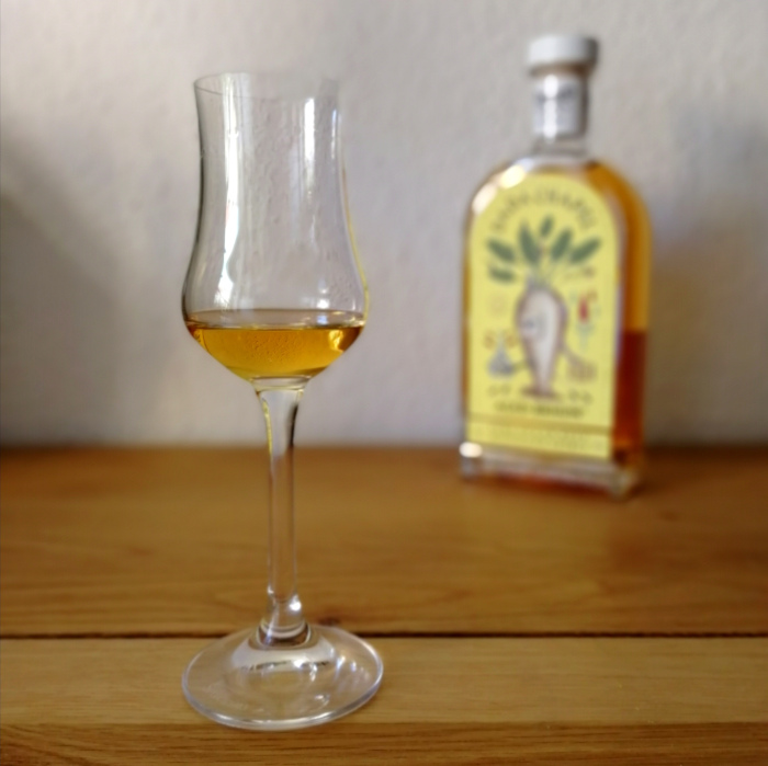 Das Jahr, das die Zuckerrübenspirituose in Fässern aus amerikanischer Eiche (auf der Shopseite findet man den Hinweis, dass es sich um eine Mischung aus amerikanischer und französischer Eiche handelt) ruht, lässt eine elegante, gelbgoldene Farbe entstehen – es wird nicht gefärbt. Man sieht darüber hinaus schöne Viskosität beim Schwenken und langsam ablaufende Beinchen.