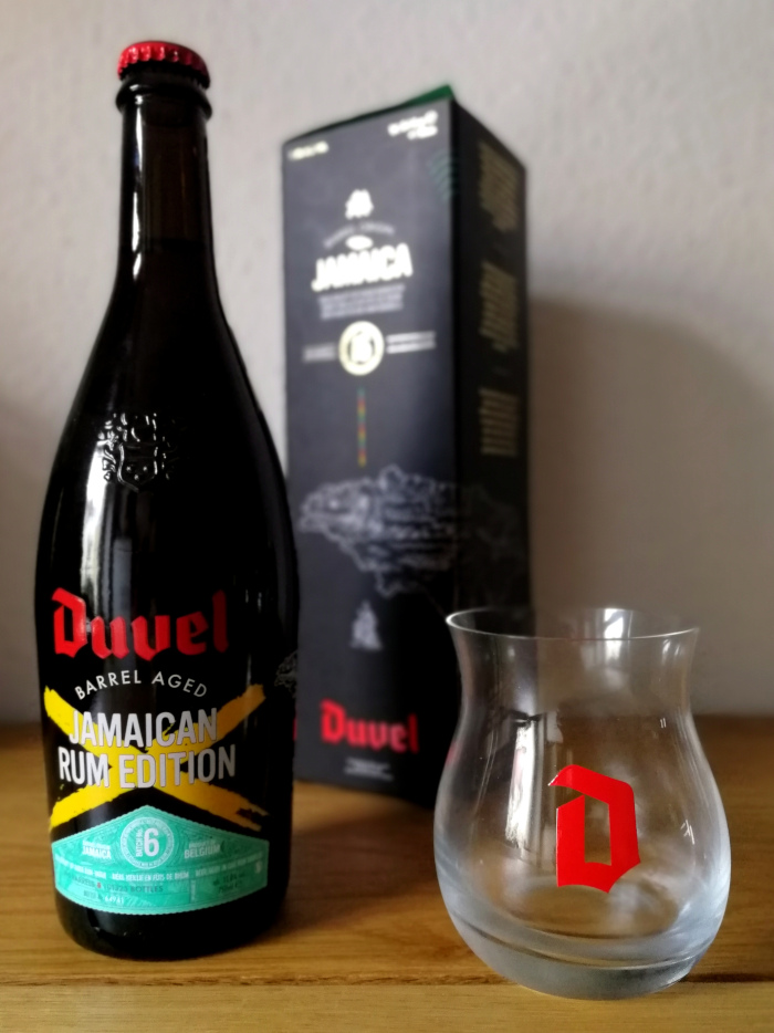 Belgisches Bier und jamaikanischer Rum – zwei meiner Lieblinge, in einem Produkt vereint! Das klingt ja schon grandios, und ich war sehr gespannt auf das Duvel Barrel Aged Jamaican Rum Edition. Dies ist die 6. Auflage ihrer Fassreifungsreihe, „Duvel Barrel Aged Batch No. 6“, wie es auf dem Etikett steht. Es handekt sich dabei um ein Starkbier mit 11% Alkoholgehalt, das in Fässern gereift wird, das vorher jamaikanischen Rum (ohne genauere Angabe einer Destillerie) enthielt. 390 Fässer hat man sich bei Duvel dafür reserviert, und diese ergaben am Ende die stattliche Anzahl von 101325 daraus abgefüllten 750ml-Flaschen. Meine Flasche hat die Nummer 64941, das ist zwar eine Limitierung, aber eine doch recht großzügige. Nachdem ich die Flasche auf die empfohlene Trinktemperatur von 5°C herabgekühlt habe, gieße ich mir nun ein Glas ein; wie praktisch, dass in dem Set gleich ein gebrandetes Glas mit großem, roten „D“ darauf genau dafür mitgeliefert wird!