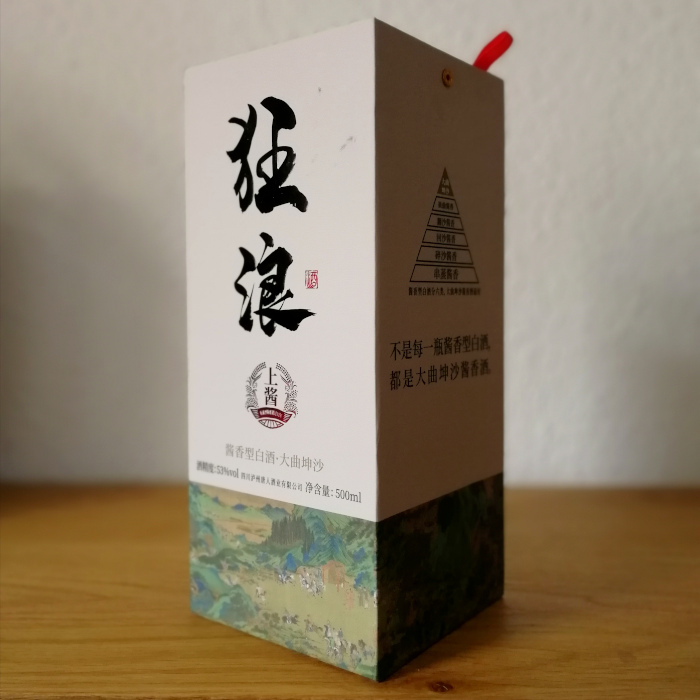 So zum Beispiel die Hauhan International Trading Co.,Ltd., die mit ihren Produkten aktuell versucht, die weiterhin große Lücke an hochqualitativen Abfüllungen zu verkleinern. Als Beispiel stelle ich hier nun den Kuanglang Shangjiang Baijiu (狂浪酱香酒-上酱) vor – man beachte, der Hersteller nennt diese Marke selbst „IKuang“, wobei ich mir über das initiale „I“ unsicher bin, ich halte es einfach für einen Designtrick, mit dem man den vertikalen Strich des Ks betonen will, denn in den offiziellen Werbevideos des Abfüllers wird das I nicht ausgesprochen. Die zwei prominenten chinesischen Zeichen 狂浪 auf Karton und Flasche jedenfalls pinyinisieren sich als „Kuanglang“; wer sich für diesen Baijiu interessiert, sollte also vielleicht parallel nach „Kuanglang“ und „IKuang“ suchen. Das ist natürlich nur der Markenname, die spezielle Sorte nennt sich „Shangjiang“ 上酱, und wir bekommen damit ein Exemplar des besonders in Süd- und Südwestchina beheimateten Soßenaroma-Stils, im Dorf Yunlongjie bei Luzhou in Sichuan wird der Baijiu hergestellt. Man verwendet dafür laut Dokumentation „red tassel sorghum“, was wohl Sorghum bicolor ist, und Weizen. Wie für den Stil üblich geschieht dies mittels Trockenfermentation und -distillation, in klassischer und entsprechend aufwändiger Weise in mehreren Zyklen, in denen das einmalige Aroma entsteht. Der Hauptteil des „Kunsha“-Destillats (was dem höchsten Qualitätsstandard für Sorghum-Destillate entspricht) wird mindestens 12 Jahre in Tonkrügen gereift, und dann mit einem kleinen Anteil von 30 Jahre altem Brand geblendet. Das Ergebnis dieses langen Prozesses wollen wir uns mal nun zu Gemüte führen.