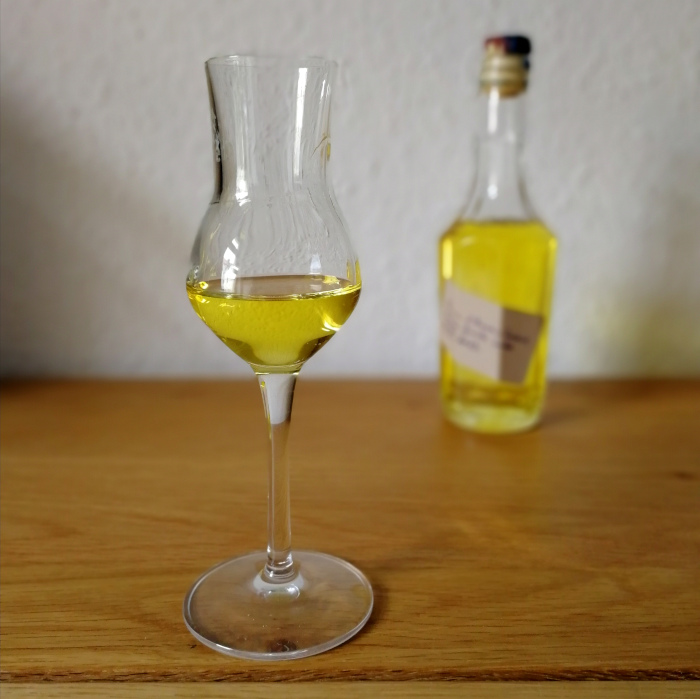 Die Flüssigkeit selbst ist ähnlich gelb wie das Etikett, und entstammt dem Einsatz von Safran – man nutzt also natürliche Zutaten selbst für die Färbung. Im Glas sieht man noch, neben der zitroniggelben Farbe, einen minimalen Grünstich. Schwenkt man das Glas, sorgt die ausgesprochen fette Viskosität für einen ähnlich dicken Film, der kammartig und langsam abläuft.