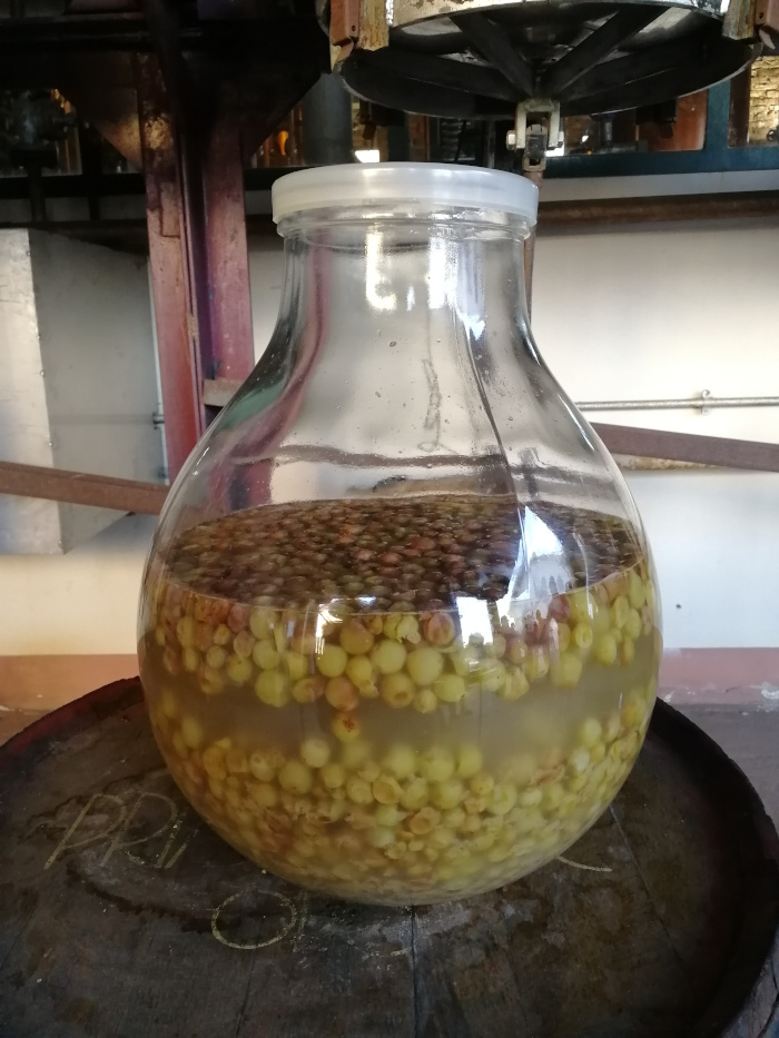 Es gibt eine Menge ungewöhnlicher Dinge, die es über die Herstellung zu berichten gibt, die sich deutlich von denen bei anderen Spirituosen unterscheiden. Die ganzen Früchte hauptsächlich der lokal sehr beliebten Rebsorte Glera werden zwischen 15 und 18 Tagen fermentiert, ohne sie vorher auszupressen. Wie bei Pisco Mosto Verde wird die Fermentation zu einem gewählten Zeitpunkt unterbrochen, bevor alle Zucker in Alkohol umgearbeitet wurden. Die dann enstandene Maische wird komplett, sogar mit allen Festbestandteilen, in den besonderen Brennapparat der Destillerie gegeben. Dieser ist ähnlich einer Bain-Marie, die mit einem Vakuumdestillierapparat kombiniert wurde – hier macht sich die Grappaerfahrung der Region bezahlt. Einmal wird nur destilliert, bei der niedrigen Temperatur von 60°C, und man nutzt den kompletten Lauf für das Endprodukt, es ist aufgrund der ungewöhnlichen Herstellungsart nicht nötig, Vor- und Nachlauf abzutrennen, weder die Problemstoffe des Vorlaufs noch die des Nachlaufs entstehen bei Prime Uve. Das Destillat wird am Ende dann auf 39% Alkoholgehalt eingestellt und, in der vorliegenden Variante, ungereift abgefüllt – und ein kleines Fläschchen davon ist bei mir gelandet, und virtuell will ich es nun mit meinen Leser*innen teilen.