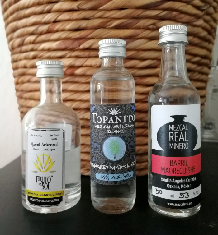 Alle drei liegen mir als offizielle Samples des Herstellers vor. Spannend ist natürlich, dass bei Mezcal oft Batches deutlich variieren. Bei Fruto del Sol und Topanito hat man genug Material für die Samples, um dedizierte Labels inbesondere bezüglich Alkoholgehalt zu drucken; Real Minero lässt die Prozente handschriftlich eintragen, um diesbezüglich flexibler zu sein.