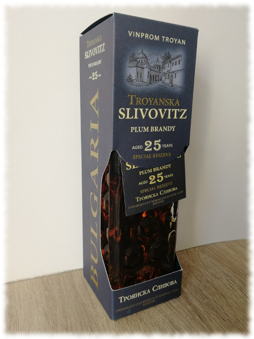 Heute probieren wir einen Pflaumenbrand aus Bulgarien, den ich damals von meiner Reise als Juror für Spirits Selection by CMB 2018 nach Plovdiv mitgebracht hatte: den Troyanska Slivovitz Special Reserve Aged 25 Years (троянска сливова ракия 25 годишна). Mit seinen mindestens 25 Jahren Ruhezeit in Eichenfässern ist er das Flaggschiff von Vinprom Troyan, dem größten Hersteller dieser Art Pflaumenbrands in Bulgarien, und darüber hinaus ein Symbol für die namensgebende Region Trojan in Nordbulgarien. Wenn ich etwas auf meiner Reise dorthin gelernt habe, ist es, dass im gesamten Großraum schon seit mindestens der Römerzeit extensiv Wein angebaut wird, und das viele Obst, das die klimatischen und bodenbezogenen Eigenheiten der Region zu schätzen weiß, gerne in vielerlei Bränden, wie überall auf dem Balkan Rakiya genannt, verarbeitet wird. Bis heute legt man großen Wert auf diese Tradition, und der Slivovitz Special Reserve ist durchaus als diesbezügliches Prestigeobjekt zu betrachten. Was uns nicht daran hindern sollte, ihn nun zu probieren!