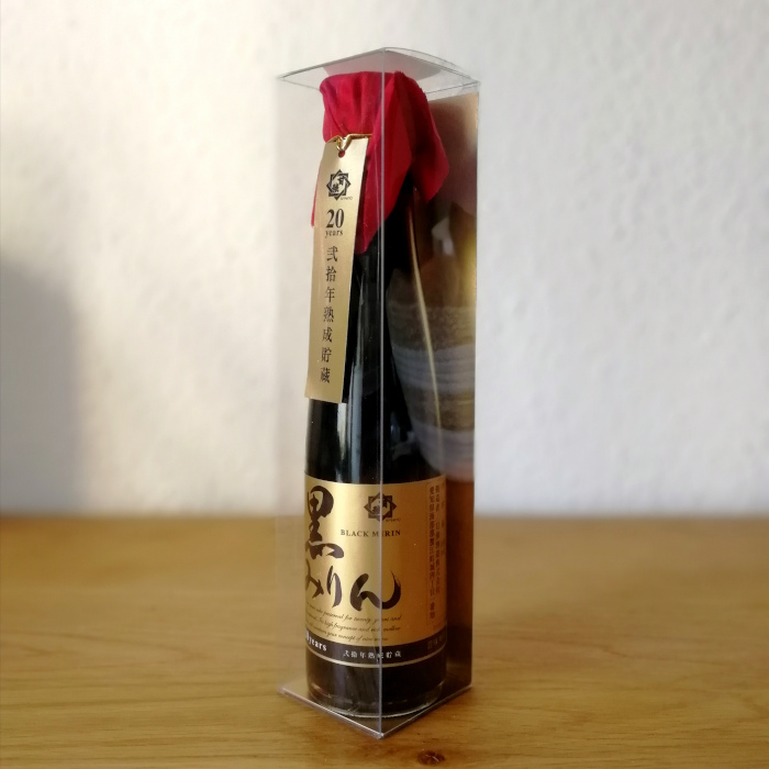 Mirin ist eine japanische Spezialität, die der eine oder andere sicher schon zu sich genommen hat, ohne es zu wissen. Die höchste Qualitätsstufe davon, der Hon Mirin („echter“ Mirin), wird aus drei Zutaten gemacht – Klebreis, Koji (ein enzymreicher, bakterienbasierter Fermentationsstarter, der auch bei beispielsweise Sake verwendet wird) und Reis-Shochu. Der Reis wird mit dem Koji geimpft, und muss dann rund 2 Monate reifen – in der Zeit spalten die Enzyme die Stärke im Reis auf und lassen Zuckerarten und Aromen zurück. Mit dem Shochu wird dann die Verzuckerung zu einem gewählten Zeitpunkt unterbrochen und man erhält eine likörartige Flüssigkeit, die in der japanischen Küche hauptsächlich als Kochzutat genutzt wird (daher mein einleitender Kommentar), aber, wie man beim Kankyo Shuzo 20 Years aged Black Mirin (Kuro 20 Hon Mirin) (弐拾年熟成 黒みりん) sieht, den ich heute vorstelle, sich auch als eine durchaus als reines Genussmittel geeignete Genießerware präsentieren kann!