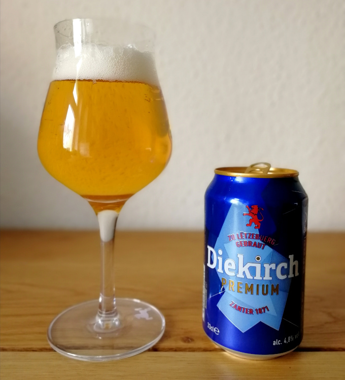 Probieren wir erstmal die kleinere Dose. Das Diekirch Premium wird als „bière blonde“ oder Lager deklariert, ganz klar ist das nicht, wir wollen aber auch nicht päpstlicher sein als der Papst. Jedenfalls weist es 4,8% Alkoholgehalt auf und ist im Glas kristallklar, strahlend blond, ohne jeden Anflug von Trübung. Reinweißer Schaum bildet sich fingerdick, bleibt halb so stark eine ganze Weile stehen. Man sieht leichtes Mousseux. Ein optisch sehr ansprechendes Bier.