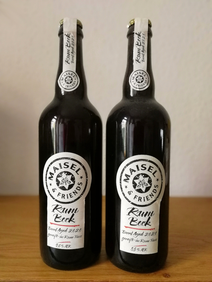 Die Haltbarkeit von Bier ist eigentlich besser, als viele denken. Natürlich verlieren viele leichte Biere an Spannung, wenn man sie lange aufbewahrt, und stark auf Hopfen setzende Produkte, insbesondere wenn kalt- und frischgehopft, sollten zeitnah getrunken werden, weil der Hopfengeschmack als erstes verfliegt. Andere Biere, gerade stärkere, eher malzlastige, können dagegen über viele, viele Jahre, teils sogar Jahrzehnte aufbewahrt werden, und reifen dabei sogar, statt schlecht zu werden. Für den Maisel & Friends Rum Bock Barrel Aged 2020 habe ich einen Mittelweg gewählt und öffne ihn nach 4 Jahren, die er bei mir zuhause kühl und dunkel ruhte. Das besondere hier ist natürlich die Fasslagerung im Rumfass, da ist man gespannt, was die Interaktion zwischen Rum, Holz und Bier so hervorbringt!
