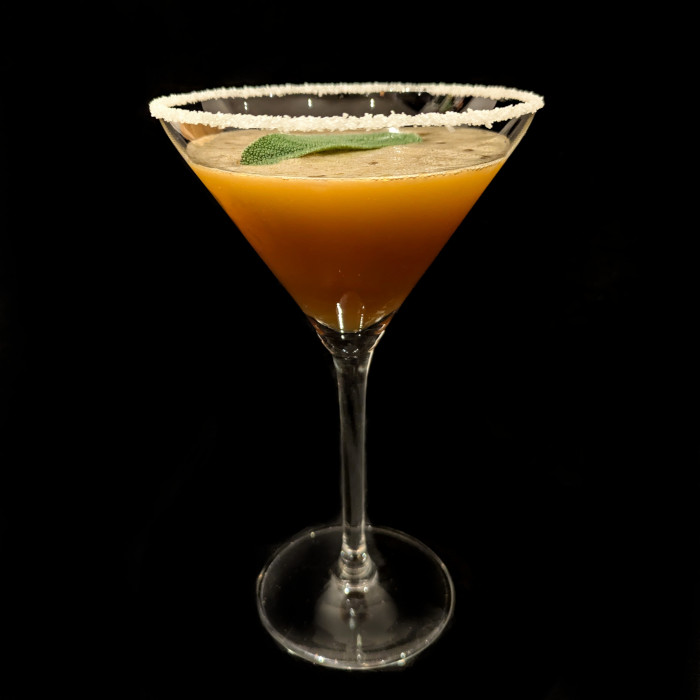 Auf Eis shaken, in ein Glas mit Vanillezucker-Rand abseihen und mit einem Salbeiblatt dekorieren.