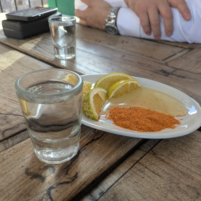 So einen Mezcal trinke ich gerne aus einem Veladora-Glas, das gut in der Hand liegt und authentisch ist. Man sieht auch in so einem Glas die leichte Viskosität und den Rand, der sich beim Schwenken bildet, aus dem die Beine ablaufen. Glasklar ist die Flüssigkeit, natürlich, das erwähne ich nur am Rande.