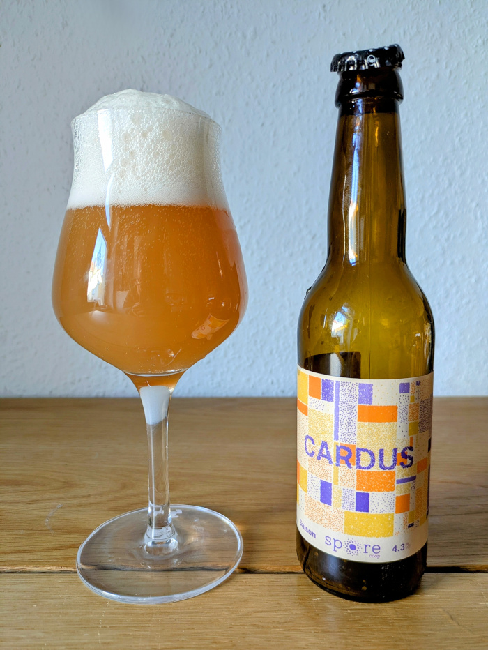 Zwei Sätze, die die Stimmung perfekt setzen. Ich bin ja sehr empfänglich für Storytelling, wenn es gut gemacht ist, und bei mir resoniert diese Beschreibung sofort im Kopf wie der Klang der geöffneten Flaschen in der Kürzestgeschichte. Da will man sofort nach Gravigny in der Normandie, im heißen Sommer. Das zweitbeste, was man mit soviel Fernweh und Kopfkino tun kann, ist einfach das entsprechende Bier genauso zu öffnen, wie es die Einwohner dort scheinbar abends um 6 regelmäßig tun. Das Brasserie Spore Cardus Saison, eingebraut mit Gersten-, Dinkel- und Roggenmalz in Bioqualität (das Endprodukt ist ebenso zertifiziert mit einem entsprechenden EU-Siegel), hat mit 4,3% Alkoholgehalt auch nicht zuviel Wumms, um einem bei der Hitze die Birne zu verbiegen.