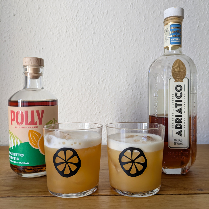 Wie es bei alkoholfreien Destillaten oft gilt – sie dienen weniger dem Purgenuss, das mache ich für den ISW, aber zuhause sehe ich keinen Sinn darin. Darum gehe ich einen anderen Weg, habe ich mir den Rezeptvorschlag auf der Rückseite der Flasche herangezogen und die Zutaten, die dafür auch im Paket mitgeliefert wurden, verwendet (also Zitronen-Direktsaft und 100% Orangensaft aus Orangensaftkonzentrat). Um einen Vergleich zu haben, ziehe ich ein Referenzprodukt für Amaretto heran, den Amaretto Adriatico – er kommt in gleichen Verhältnissen und mit denselben weiteren Zutaten in das zweite Glas. Hier das Rezept, es ist eine einfache Sour-Variante, die nicht mit dem klassischen Rezept von Jeffrey Morgenthaler verwechselt werden sollte, der ja noch Bourbon und Eiweiß verwendet.