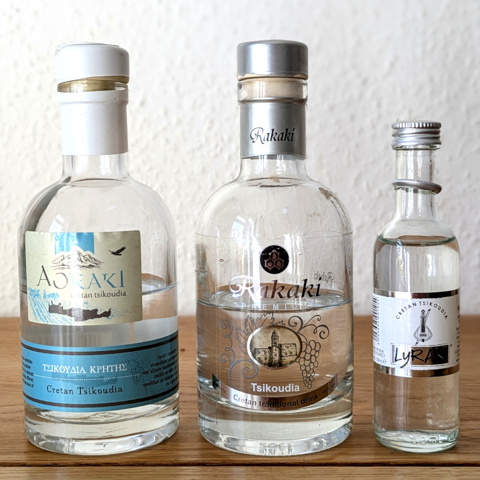Drei Marken biete ich heute an: Aoraki, Rakaki und Lyraki, die klingen schon ähnlich, da ist man gespannt auf die Unterschiede. Alle drei sind „pur“, also nicht mit Anis aromatisiert, und auf Kreta in kleinen Supermärkten gekauft, dort bekommt man sie in diversen Größen für sehr erschwingliche Preise (man sollte sie jedenfalls nicht in den Touristen-Souvenir-Läden holen, da ist direkt ein enormer Preisaufschlag im Vergleich zu den Supermärkten da).