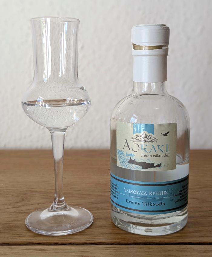 Irgendwie muss man das Backlog auch bei einer Heimbar pflegen, insbesondere, wenn sich Dinge schon Jahre darin aufhalten und irgendwann auch mal zu ihrem Recht kommen sollen. Aus diversen Kreta-Urlauben hatte ich mir immer ein paar Kleinflaschen der lokalen hochprozentigen Produkte mitgebracht, und neulich entdeckt, dass die eigentlich noch nie besprochen worden waren. Und so kommt heute mal wieder eine Gruppenbesprechung hier – die Gemeinsamkeit, die ich für soetwas voraussetze, ist die Spirituosenkategorie; bei den drei Bränden, die ich heute vorstelle, handelt es sich um Tresterbrand. Der offizielle griechische Name für diesen kretischen Tresterbrand ist Tsikoudía (eine Unterform des Gesamtgriechischen Tsipouro), auf Kreta sagt man in der Regel Raki dazu, wer schonmal dort war, kennt das selbstverständlich, denn Raki gehört auf Kreta mit zur unwegdenkbaren Lebenskultur, gefühlt jeder brennt auch seinen eigenen Hausraki. Ich habe vor einer Weile schonmal was über Raki geschrieben, und ergänze diese Eindrücke nun mit folgenden Produkten.