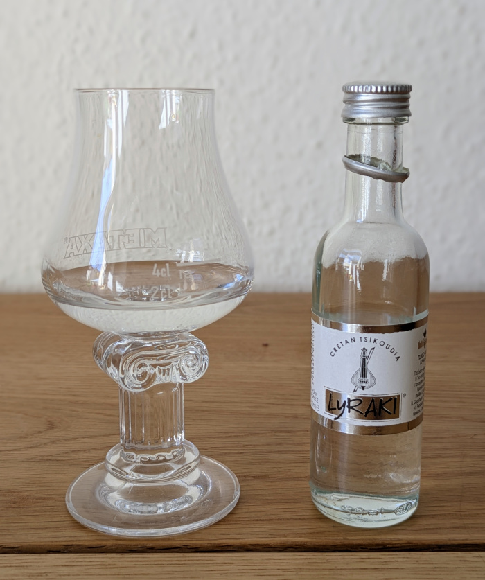 Bisher wurden wir nicht außergewöhnlich verwöhnt mit kretischer Lebensart, das muss man schon sagen. Ein dritter Versuch erfolgt nun mit dem Lyraki Cretan Tsikoudia, der auch mit 40% Alkoholgehalt in die kleine Flasche kommt, die sogar in einer kleinen Dose verpackt ist.
