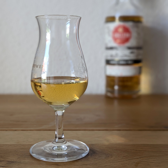 In der Nase spürt man erstmal die Gerste, die Getreidenote ist sehr dominant. Haferflocken kommen passend dazu, und dann eine volle, säuerlichsüße Fruchtseite, die mich an roten Apfel, Quitte und etwas Litschi erinnert. Honig ist da, und ganz unten auch eine balsamische Note, die Anflüge von Süßholz, Eukalyptus und Zedernholz zeigt. Man spürt hier bereits, dass man einen noch jungen Whisky vor sich hat, der Körper wirkt leicht und schmal, hat aber durchaus interessante Ansätze, was die Aromatik angeht.