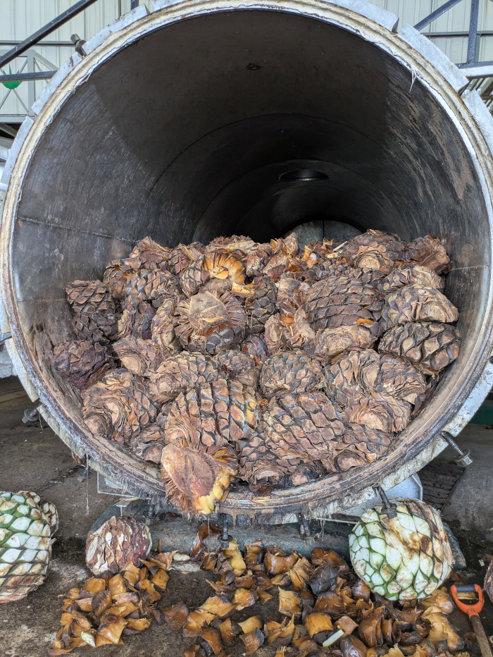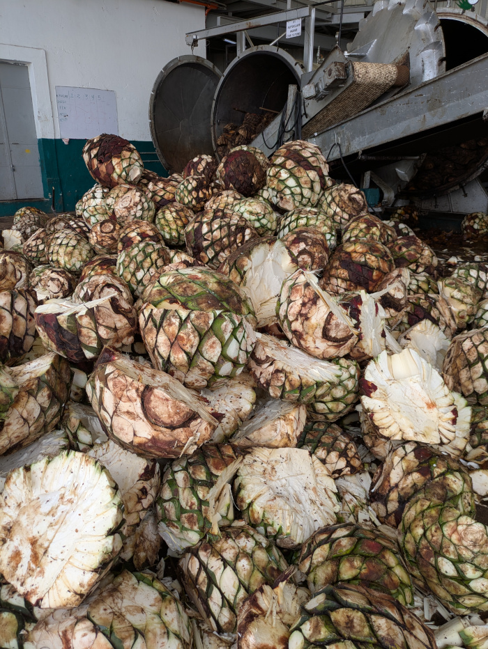Die kleine Flasche habe ich bei meinem Besuch der Brennerei mitgenommen – es ist immer wieder toll, solche Orte persönlich zu sehen, zu riechen, zu fühlen, auch wenn man bei Agaven vorsichtig sein muss, denn selbst in entblättertem Zustand haben sie winzige Haarnadeln, die Juckreiz verursachen können, wenn man sie zu bedenkenlos mit der Haut in Kontakt kommen lässt. Die Bilder sind in Verarbeitungsreihenfolge – erst kommt der LKW mit den geernteten Agavenherzen an der Brennerei an, dann werden sie im Hof weiter zerkleinert. Nachdem sie in den Autoklaven gekocht wurden, sieht man die braune Farbe und schmeckt den saftig-karamelligen Geschmack. In Betongruben findet bei El Tequileño die Fermentation statt, offen natürlich. Der letzte Schritt ist die Destillation in den kleinen Kupfer-Potstills.