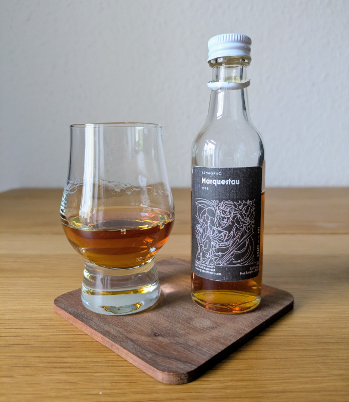 Mit Selbstbewusstsein wird der Grape of the Art Marquestau 1998 Armagnac mit dem schwarzen Etikett mit einem Superhelden versehen, mit plakativem „M“ auf der Brust, der in bester Superman-Manier, die Faust voraus, auf einen zufliegt. Aus der Region Bas Armagnac stammt er, seine Basis findet er rein in der Rebsorte Baco. Alles andere als Fassstärke wäre dem Helden nicht angemessen, hier sind es 51,7% Alkoholgehalt – das Fass #225, das Grape of the Art für sich ausgewählt hat, hat nur 310 Flaschen dieser Art hervorgebracht, abgefüllt im September 2024, nach 25 Jahren Lagerung in eben jenem Fass. Ich hoffe, mein Verkostungsglas springt nicht bei soviel geballter Armagnacmacht!
