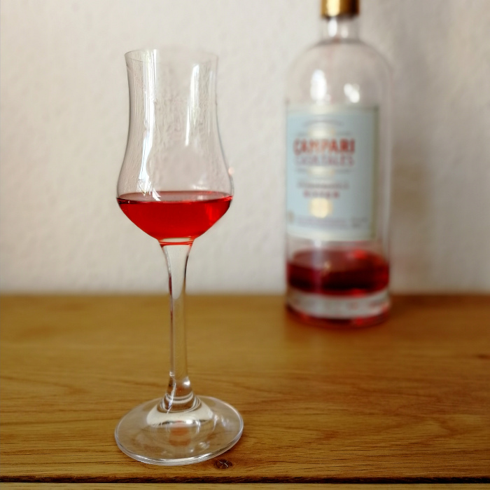 Was ist das besondere an Campari Cask Tales im Vergleich zum doch deutlich günstiger erhältlichen Standardprodukt? Man nimmt dafür eben diesen klassischen Campari und reift ihn noch eine gewisse Zeit in Ex-Bourbon-Fässern (es war wohl Wild Turkey, der zuvor in den Fässern lag). Eigentlich eine verständliche Sache, und es gibt diverse Liköre, die schon immer fassgereift werden, wie das Elixir d’Anvers, also ist die Idee nicht so dramatisch ungewöhnlich, wie sie zunächst klingen mag. Der Alkoholgehalt ist gleich geblieben, die 25% sind in Deutschland Standard. Für mich ist die Kombination Bourbon-Campari darüber hinaus auch eine ganz selbstverständliche, der Boulevardier ist einer meiner absoluten Lieblingsdrinks, wer ihn nicht kennt, sollte diese Lücke im Lebenslauf schnellstmöglich füllen. Vielleicht sogar mit einer Unze des Cask Tales? Nun, schauen wir mal, ob sich der ordentliche Aufpreis lohnt.