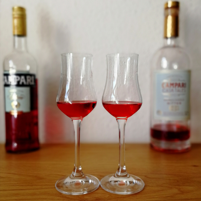 Im Vergleich sieht man, wenn man genau hinschaut, dass der Cask Tales ein bisschen weniger rot ist, einen orangenen Ton angenommen hat, und dieser haftet dann auch etwas dichter an der Glaswand. Die Fassreifung hat etwas von der harten Kante, die der normale Campari hat, abgerieben, und ein paar Vanilletöne dazugefügt; so wird er in der Nase erkennbar weicher und sanfter, und hat sogar fast einen parfümigen Seitenaspekt bekommen. Das spürt man auch am Gaumen, der Cask Tales wirkt abgerundeter, milder, verliert auch hier etwas von der Strenge, die der ungereifte Likör hat. Das spielt sich alles im kleinen Rahmen ab, man erwarte also keine komplette Charakterveränderung – auch der Cask Tales ist und bleibt ein Campari, mit der typischen Bittere und Aromatik.