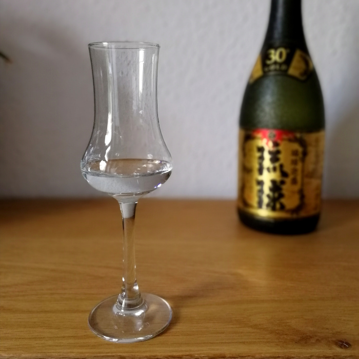 Im Mund kommt die Erdigkeit dann aber unerwarteterweise gar nicht so vor, der erste Eindruck ist mehr überraschend floral und süß, die weiterhin klar erkennbaren Kartoffelaromen präsentieren sich eher frisch als lang gelagert, man fühlt sich mehr in einer Blütenwiese als im dunklen Keller; ein sehr schöner Kontrast, der da zwischen Nase und Gaumen aufgespannt wird. Die Textur ist sehr weich, wirkt initial cremig, bildet aber nur wenig Körper aus, das ist klar den 30% Alkoholgehalt geschuldet. Der niedrige Alkohol lässt trotzdem viele Aromen zu, so dass dieser Awamori nicht wässrig wirkt, vor allem im Verlauf, wenn sich dann eine ganz feine Pfeffrigkeit dazugesellt. Der Abgang ist wärmend und durchaus lang, lässt ein ganz dezentes Glühen im Mundraum zurück, zusammen mit den nun wieder auftauchenden süßfloralen Blüteneindrücken und einem mostigen Gefühl.