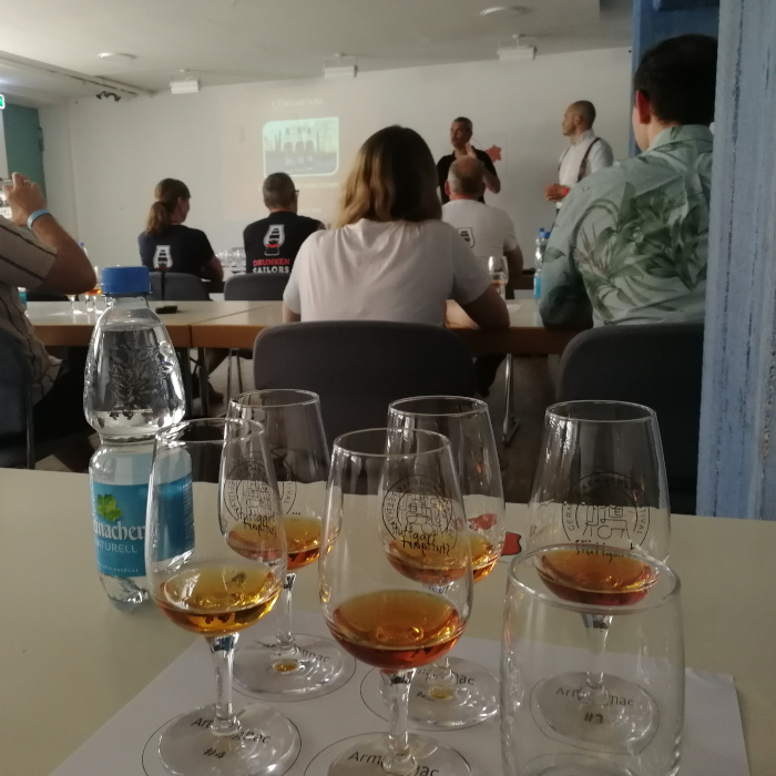 Wir hatten uns bereits auf verschiedenen Reisen kennengelernt, als Juroren für den internationalen Spirituosenwettbewerb Spirits Selection by Concours Mondial de Bruxelles, und darum fand ich es sehr schön, Hugues Amesland von der Domaine Rounagle und Vincent Cornu des unabhängigen Abfüllers L’Encantada auf dem 1. German Armagnac Festival, das im Juni 2023 in Stuttgart stattfand, wiederzusehen (ich hatte hier kurz schon darüber erzählt). Ich genieße solche Treffen immer sehr, es ist einfach schön, diese sympathischen Menschen, die man so kennenlernt und die eine gemeinsame Leidenschaft teilen, so unerwartet mal wieder zu sehen und mit ihnen über alte Zeiten und neue Entwicklungen zu tratschen. Auch andere, mit denen ich mich sehr gern unterhalte, waren da, Sebastian Jäger von Kirsch Import zum Beispiel, Jürgen Deibel, und Nicolas Kröger, und natürlich noch die Jungs von Grape of the Art und armagnac.de, die die Veranstaltung ja auf die Beine gestellt hatten. Ich freue mich definitiv auf die zweite Iteration dieses Festivals!