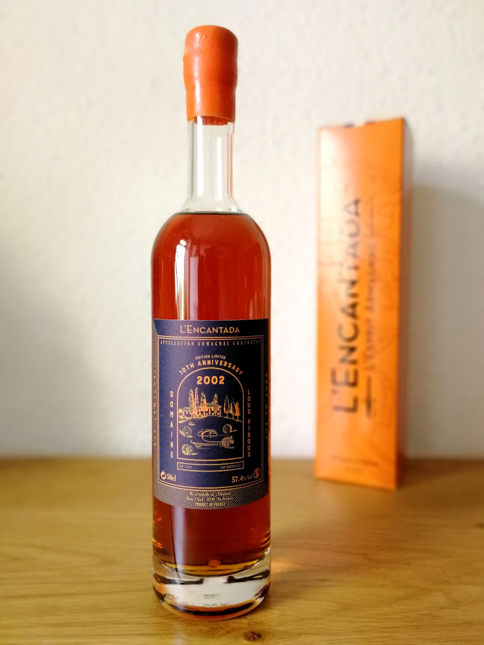 Bei letzteren, armagnac.de, geleitet von Sascha Junkert (noch so einer, den ich schon vor vielen Jahren unter sehr besonderen Umständen kennengelernt hatte!), habe ich dann nach dem L’Encantada-Masterclass-Tasting, das auch an dem Tag stattfand – dazu weiter unten noch ein paar Worte und Bilder – direkt den Armagnac bestellt, der mich darin am meisten beeindruckt hatte: den L’Encantada 10th Anniversary Edition Limitée Domaine Lous Pibous 2002 Bas-Armagnac. Wie der lange Name schon sagt, handelt es sich dabei um eine Sonderabfüllung zur Feier des zehnjährigen Jubiläums der Firma L’Encantada, und da will man sich nicht lumpen lassen, wir haben hier ein aus der Region Bas-Armagnac stammendes Destillat aus der Rebsorte Folle Blanche des Hauses Lous Pibous, in brut de fût, also Fassstärke, mit 57,4% garantiert ohne Wasserbeigabe, Zucker- oder Holzextraktzusatz in nur 726 Flaschen limitiert abgefüllt. Die Zahlen deuten schon auf Spannendes hin, trinken wir gemeinsam einen Schluck zur Feier!