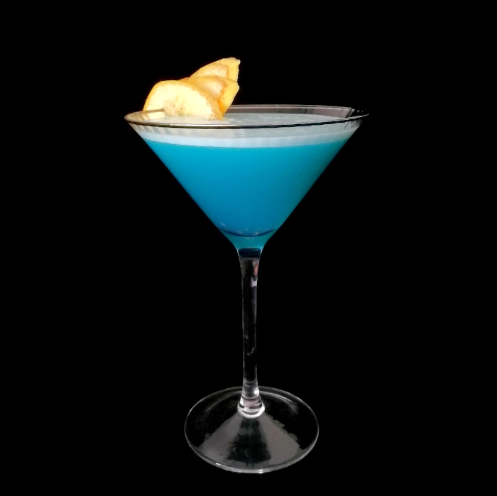 Banana Drama III 2oz / 60ml Bananen-Spiced-Rum 1oz / 30ml Zitronensaft ¾oz / 23ml Blue Curaçao ½oz / 15ml Apfellikör 1 Eiweiß Auf Eis shaken. [Rezept adaptiert nach speakeasieruk’s Banana Drama II]