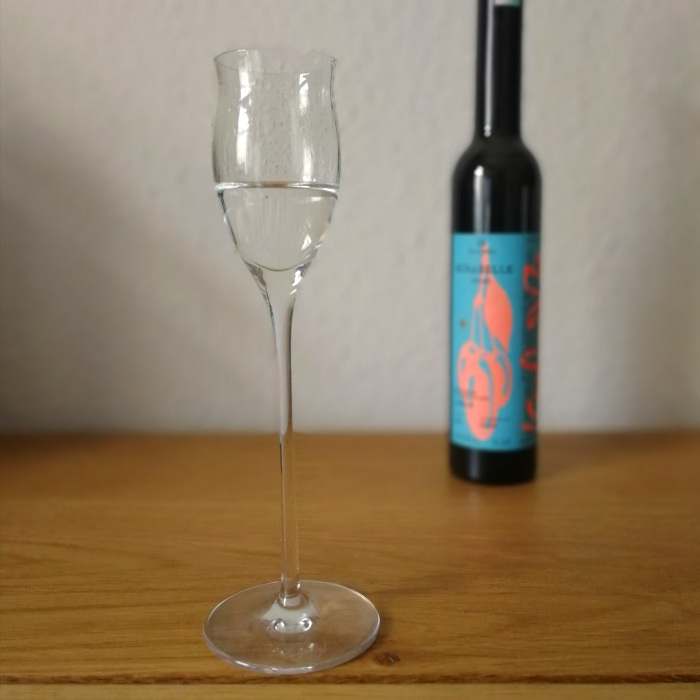 Der Brand ist erwartungsgemäß kristallklar, ohne Fehler oder Einschlüsse oder Tönung. Deutliche Öligkeit sieht man beim leichten Drehen und Kippen des Verkostungsglases, das schwappt träge hin und her, nach einer Weile bilden sich gemächlich Beine heraus, die sich richtig viel Zeit lassen, nach unten wieder abzulaufen.