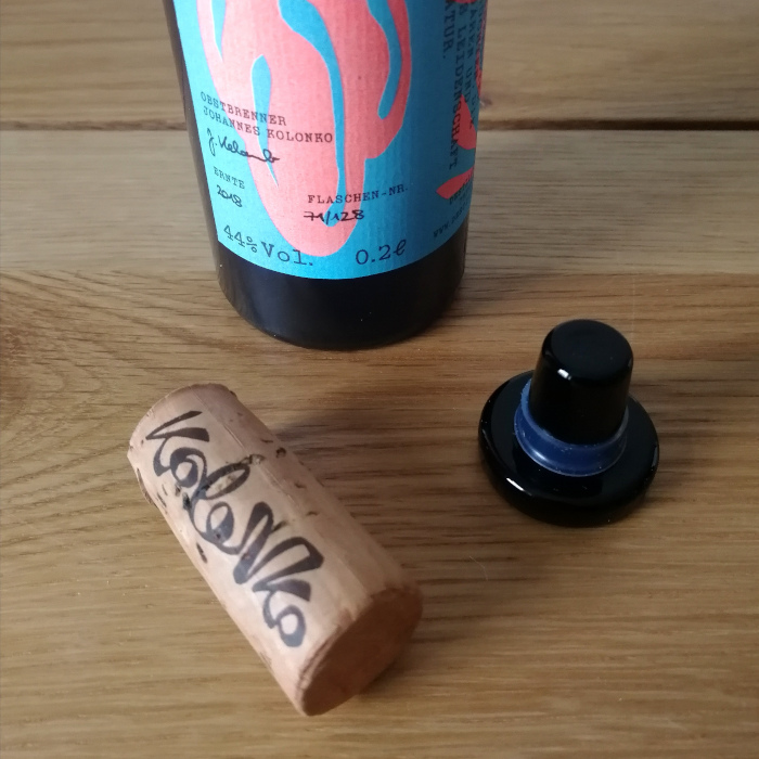 Ich erinnere mich noch gut an die ersten Exemplare dieser Glasstöpsel, die auf den Markt kamen – da waren sie noch schwer handzuhaben, das Öffnen erforderte eine gewisse Technik und auch Kraft. Heute hat sich das eingespielt, und der Glasstöpsel, der mit der Flasche hier mitgeliefert wird, funktioniert wunderbar. Es ist ja schon eine tolle Sache, dass man eine Alternative für den Echtkorken, mit dem die Flasche im Auslieferzustand verschlossen ist, an die Hand bekommt, eine schöne Geste. Das Etikett ist mit einer fast expressionistischen Darstellung der Frucht gestaltet, enthält kleine Informationen, ohne sich damit zu überladen. Die kleinen Auflagen, die Johannes Kolonko macht, zeigen sich in den wenigen 128 Flaschen aus der Mirabellenernte 2018, ich habe Nummer 71 davon.