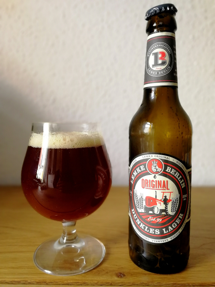 Als Basislinie habe ich mir dazu das Lemke Original Dunkles Lager geholt, einfach um zu schauen, was die Brauerei so als Grundeinstellung bieten kann. Es ist mit 5,4% Alkoholgehalt in einer Drittelliterflasche erhältlich. Beim Ziehen des Kronkorkens gibt es ein leichtes Gushing, beim Eingießen zischt es laut – da ist ordentlich Gas im Bier. Optisch gefällt es mir außerordentlich gut, eine sehr attraktive rotbraune Flüssigkeit ist da im Glas, wunderbar opalisierend, leicht trüb, mit rubinroten Lichtreflexen im Gegenlicht. Die Crema auf dem Bier ist zunächst grobblasig und kurzlebig, nach ein paar Minuten ist noch ein Schaumrand und ein großer Schaumkontinent erhalten.